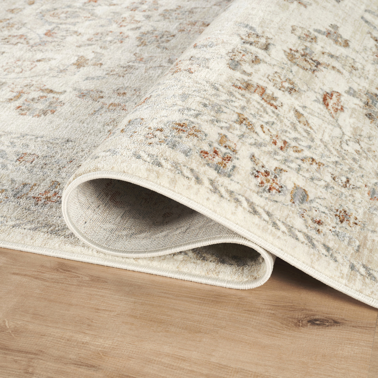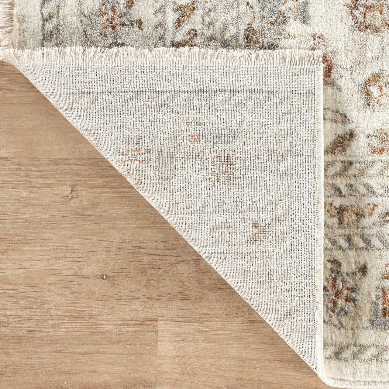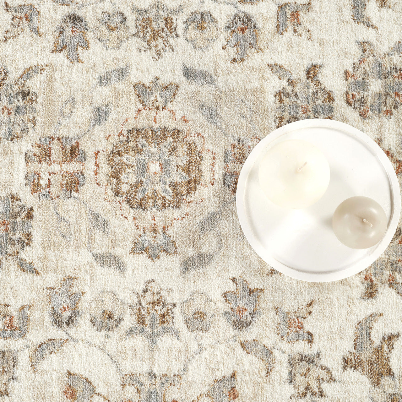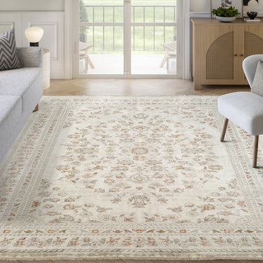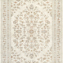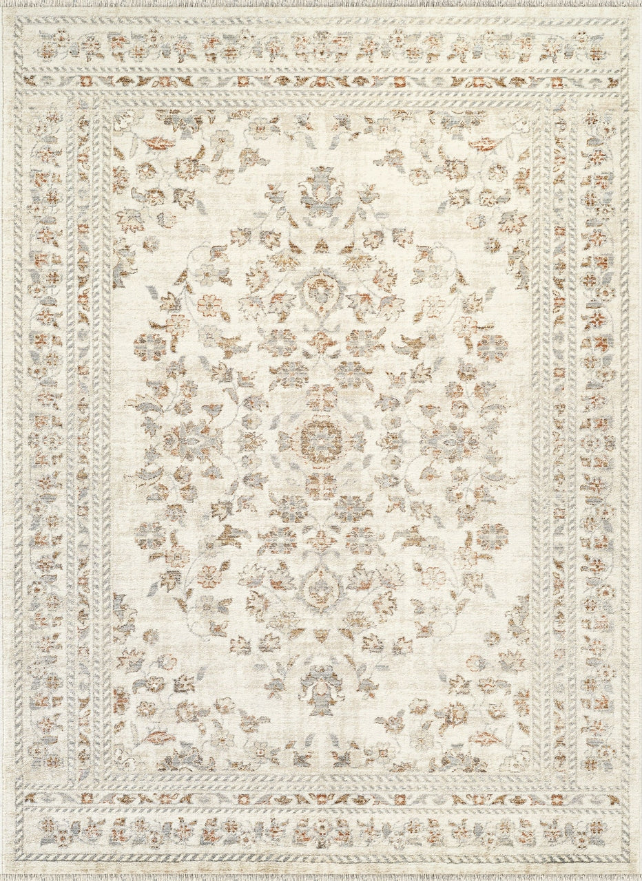 Classic and refined, this ivory and beige area rug features a traditional floral medallion pattern framed by an ornate border. Subtle distressing and soft touches of blue and rust add vintage character while keeping the overall palette neutral and versatile. This rug is an elegant foundation for living rooms, dining areas, or bedrooms, bringing timeless charm and understated sophistication to any space.