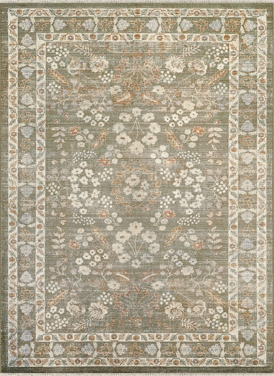 This sage green area rug showcases a vintage-inspired floral design with intricate border detailing and soft accents of ivory, rust, and pale blue. The balanced mix of color and pattern brings a calming, grounded feel to any space. Ideal for living rooms, dining areas, or bedrooms, it blends classic elegance with a fresh, updated palette.
