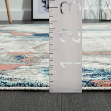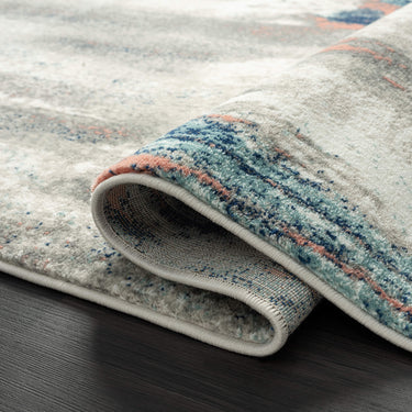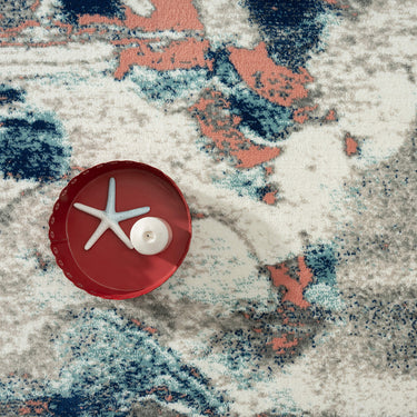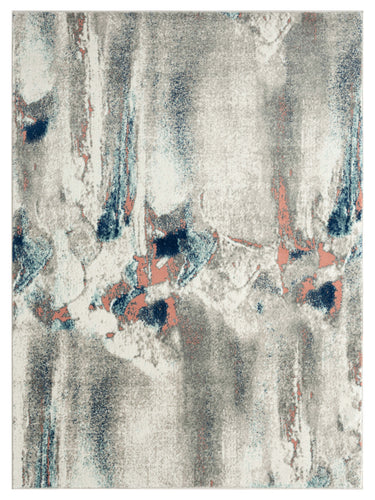 A high-quality rug with a design inspired from abstract art on a grey and beige background. The design features uneven lines and shapes in different shades of blue and coral. The whimsical effect adds an inviting touch to your décor, and the quality finish makes it ultimately comfortable. Whether you are looking for a beautiful rug for your home, workplace, or gallery, this is just the kind of rug you need.