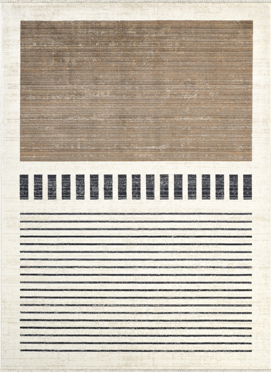 Geometric balance meets modern artistry in this minimalist area rug. Featuring a bold composition of clean stripes, stacked blocks, and earthy tones, the design creates a strong visual impact while maintaining a sense of calm. With its ivory base, brown center, and black linear detailing, this rug complements contemporary, Scandinavian, or urban interiors—perfect for grounding living rooms, dining areas, or open-concept spaces.