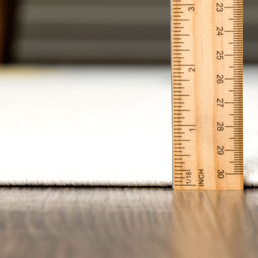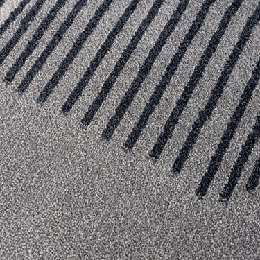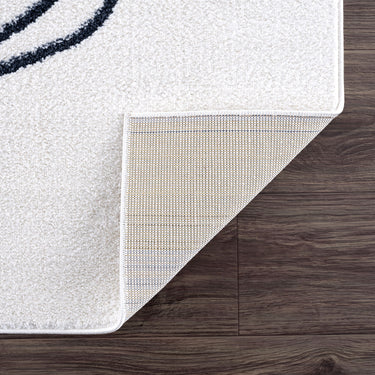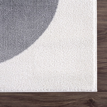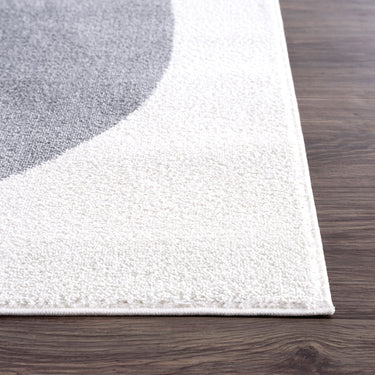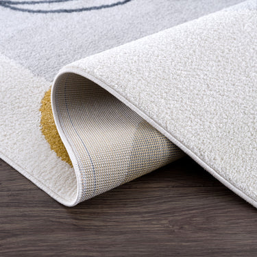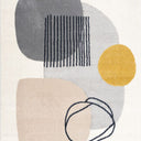 A minimalist designed area rug with interwoven circles and lines in neutral tones of cream, grey and a pop of yellow. This rectangular area rug complements any mid century decor in creating a soft neutral toned living space.