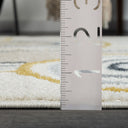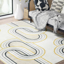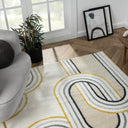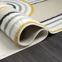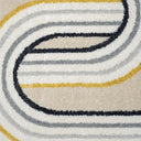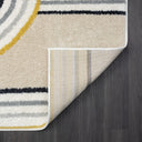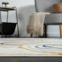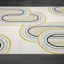 Add a subtle pop of color to your space with this modern area rug. The geometric pattern is made up of decorative linked ovals, varying in length and color. Many of these shapes link to one another, giving a feeling of community and togetherness. The shades of cream makes this piece neutral enough to blend in, but the greys and yellows can also make it stand out if desired.