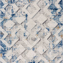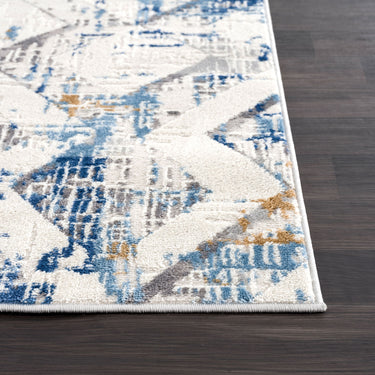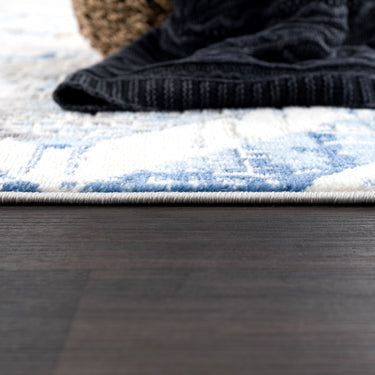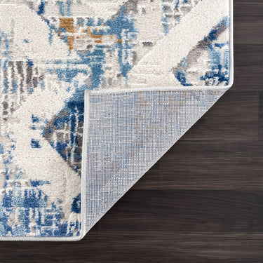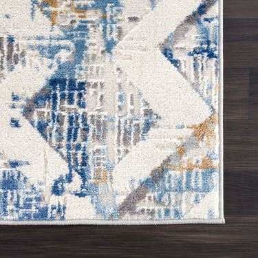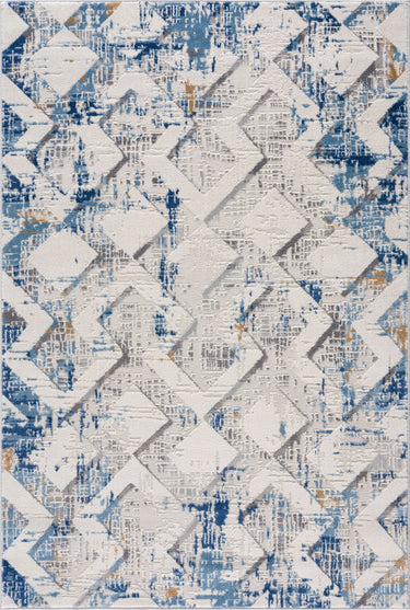 This area rug isn't afraid to explore the rich world of texture. In interior design, geometric patterns convey emotion and messages. The interwoven lines resemble a labyrinth of color, the grey overlapping with the white. With blue distressing over each cross-section, this is a multi-layered work of art. Perfect for adding durable style to any space, add a touch of texture to otherwise simple interior spaces. Whether you wish to tell a story or create a pop of color, this Dunes collection is a beautiful addition to any space.