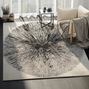 Enhance your homes modern design with our ivory and black colored burst rug from the affordable Eden Collection. This stunning piece of art not only offers design friendly colors, but it also has a bold look that was purposefully made for the creative soul. Centered in the middle of the rug you'll find a black oval shape that looks as if it was hand painted over with ivory brush strokes. Together, the ivory burst laid over the solid black color create a distressed look with grey hues, completing this rugs unique design.