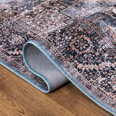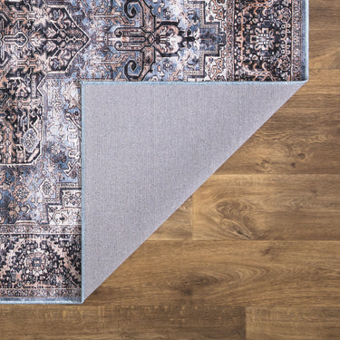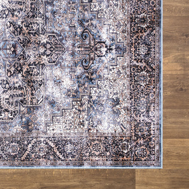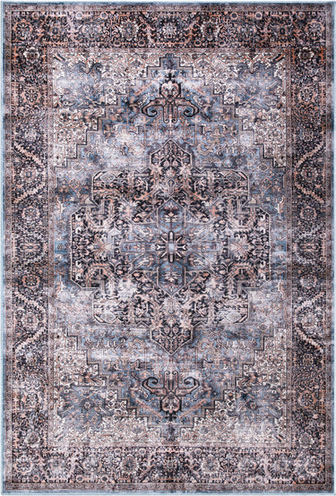 An area rug that brings vintage with a touch of chic. This rug from our Lola collection features a large floral medallion and decorated border in shades of brown and blue balanced with off-white. The whitewashing effect gives this rug a vintage feel. Rejuvenate your space with this exquisite vintage-style rug that are made for your modern lifestyle