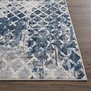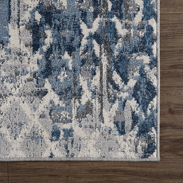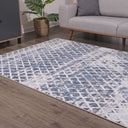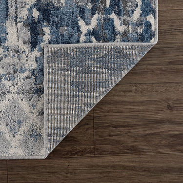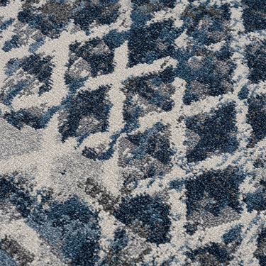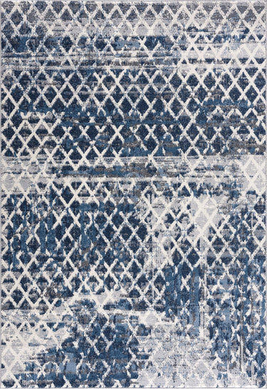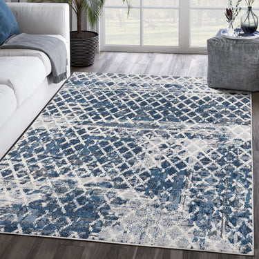 A contemporary rug in a warm blue color designed to decorate minimalist modern spaces to bring the room together. Designed with a mesh pattern in mind with an added stoned washed effect atop. The blue and grey colors work hand in hand to create a depth and elegance to the rug.