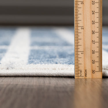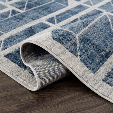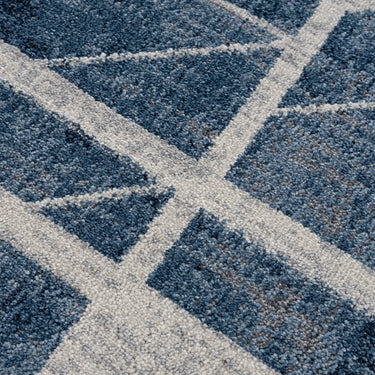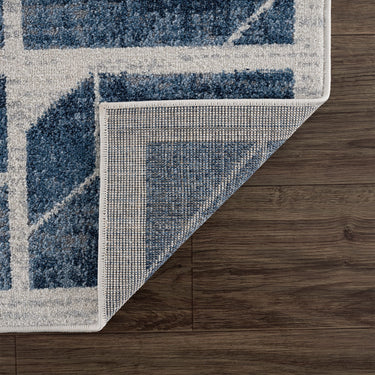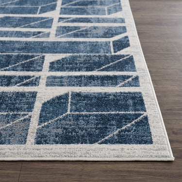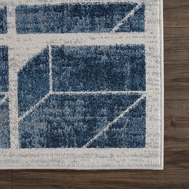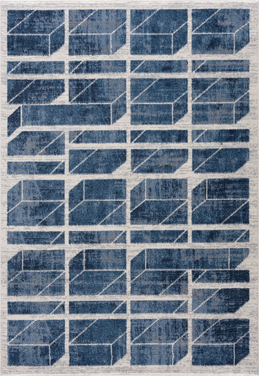 This rug has a contemporary design incorporating perspective and 3D rectangular boxed shapes throughout. The blue color on a bed of greyshas a stone washed effect which softens the design and allows it to fit in effortlessly in various spaces.