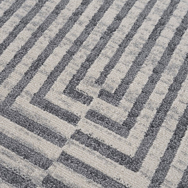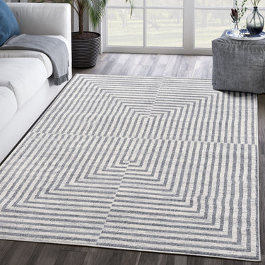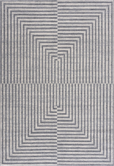 Elevate your space with this op art-inspired geometric rug in light grey and soft cream. Mesmerizing to the ideas and appealing with its illusion giving the sense of movement in a room.