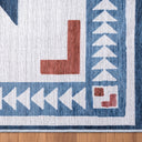 A southwestern inspired design with contrasting blue, cream and terracotta colors to modernize your space. The rug features two central diamond emblems surrounded by southwestern motifs of triangles and zigzags.