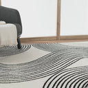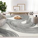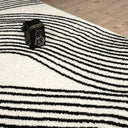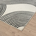 The calming pattern of this cream and black area rug is the perfect addition to any room. Reminiscent of the lines we see in the earth, this pattern creates a sense of movement and comfort. With the mellow shapes and neutral colors, this rug can round out an existing theme or be the center piece of a brand new one.