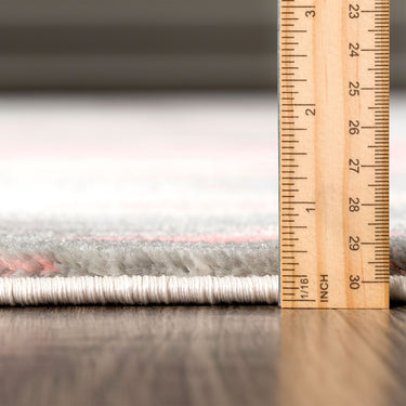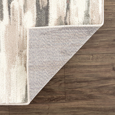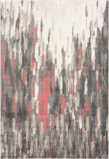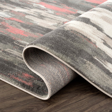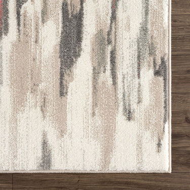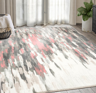 This contemporary rug is a fun blast from the past. Invite the retro charm of the 1960s with its abstract, linear style. Featuring the best of mid-century modern style, this lined splattered area rug is an artful display of strong and light creams and pinks, interwoven and interlocked together with light distressing like threads woven with a needle. This style is abstract enough to complement any clean-lined furniture or modern interior decor. By mixing muted colors of our current design era with gorgeous styles of the past, this will quickly become the centerpiece in any room of your home.