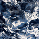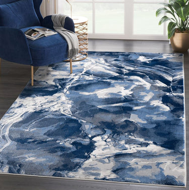 Add luxury to any space with a marble inspired area rug in royal blue, ivory and grey tones. Soft underfoot creating a stylish and sophisticated interior decor. This rug is a contemporary statement piece with chic and modern trendsetting vibes.