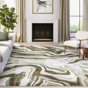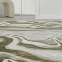 Introducing our stunning contemporary modern area rug, an exquisite piece designed to elevate any space with its captivating blend of shades of green, beige and brown swirls intertwined with bold lines. This rug effortlessly merges artistic creativity with a sleek, contemporary aesthetic, making it a perfect addition to modern interiors seeking a touch of elegance and sophistication.