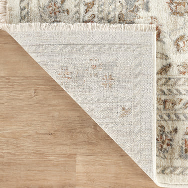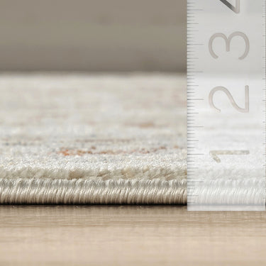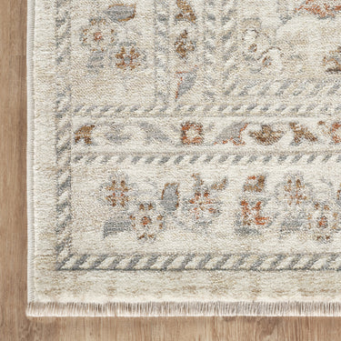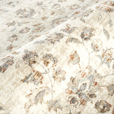 Classic and refined, this ivory and beige area rug features a traditional floral medallion pattern framed by an ornate border. Subtle distressing and soft touches of blue and rust add vintage character while keeping the overall palette neutral and versatile. This rug is an elegant foundation for living rooms, dining areas, or bedrooms, bringing timeless charm and understated sophistication to any space.