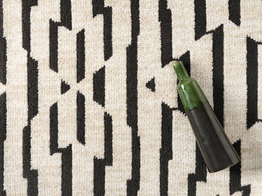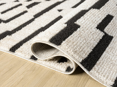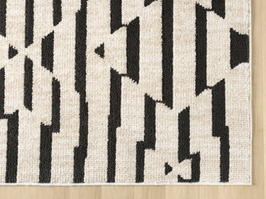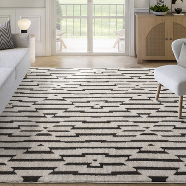 This area rug features a bold diamond motif in a crisp black and ivory palette, creating a striking visual rhythm across the surface. The stepped geometric pattern adds a modern edge with a hint of southwestern influence, making it a standout piece in both contemporary and eclectic interiors. Its clean lines and symmetrical layout bring structure and style to any living room, bedroom, or workspace.