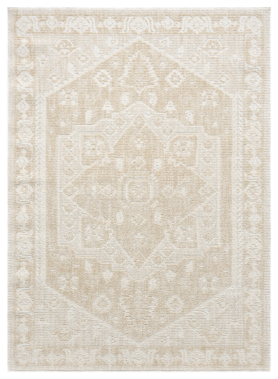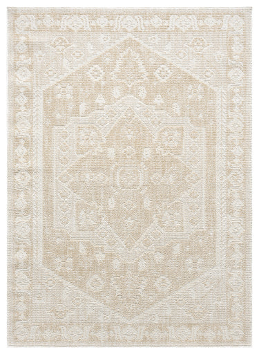 Understated yet elegant, this area rug features a gently faded medallion pattern in soft beige and ivory tones. The tonal design adds subtle texture and depth, creating a versatile foundation that complements both classic and contemporary spaces. Ideal for living rooms, bedrooms, or dining areas, it brings a touch of timeless sophistication with a modern, minimalist edge.