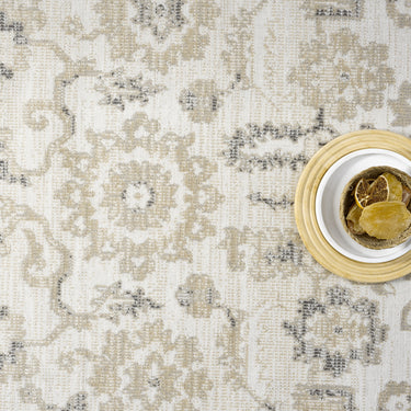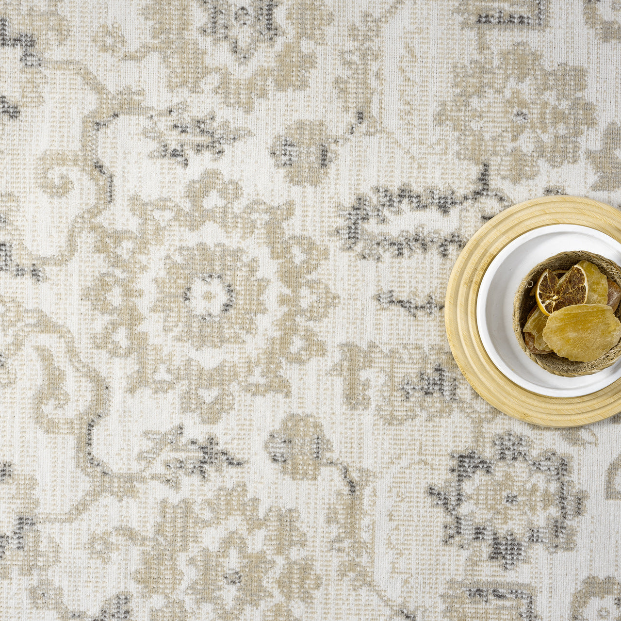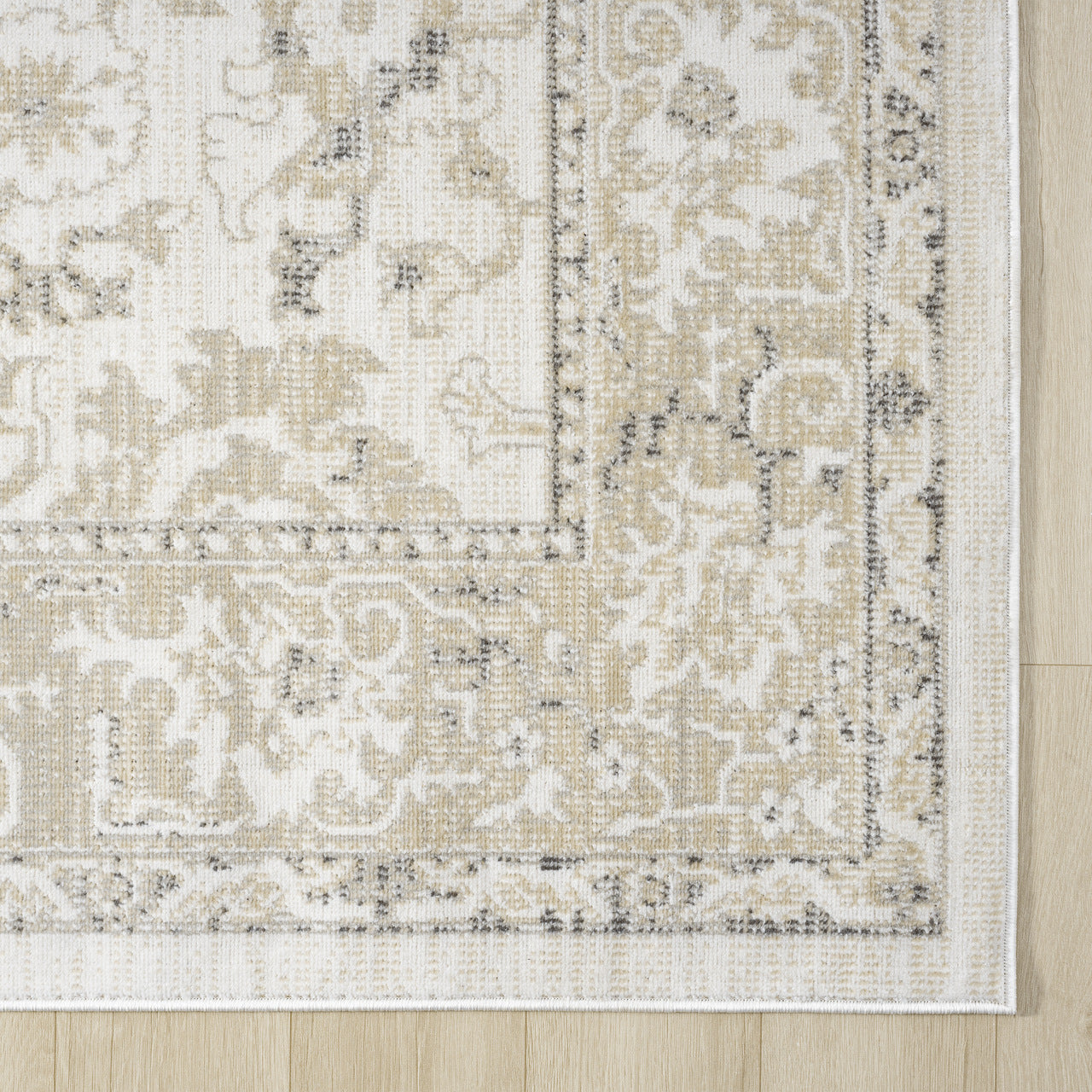 Dress your space with this area rug featuring an intricate ivory medallion surrounded by a delicate botanical border. Woven in durable, fade-resistant fibers, this medallion rug withstands wear and fading. Ideal for formal living rooms or dining areas, it delivers timeless elegance and simple maintenance.