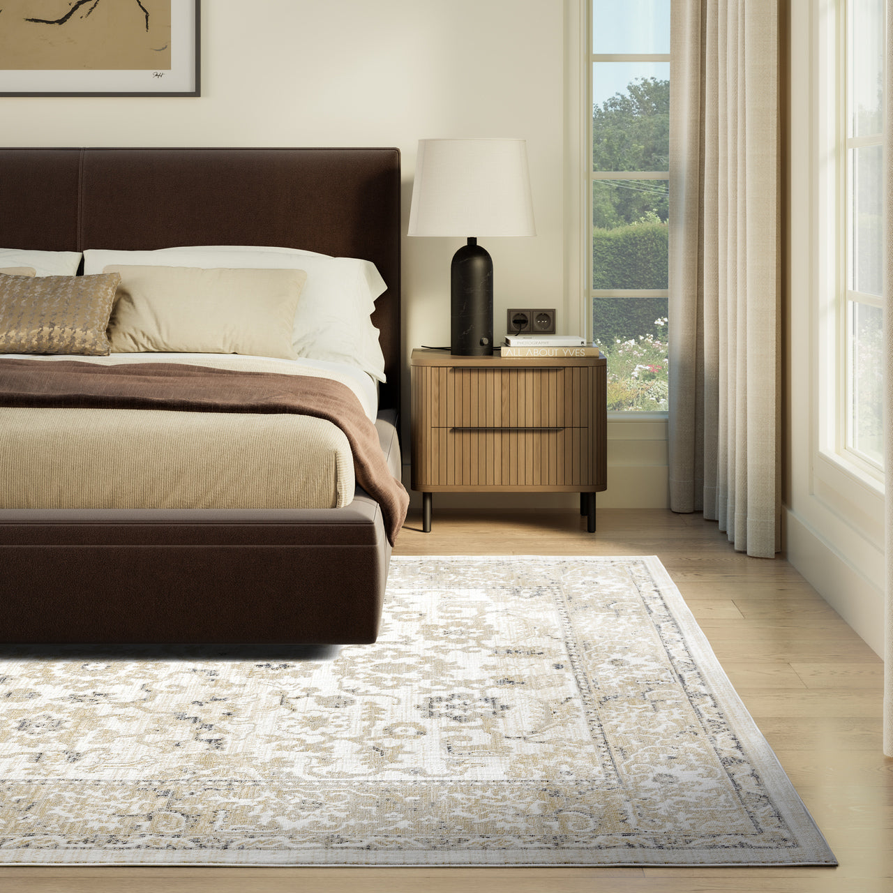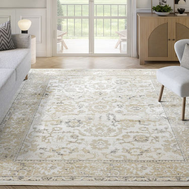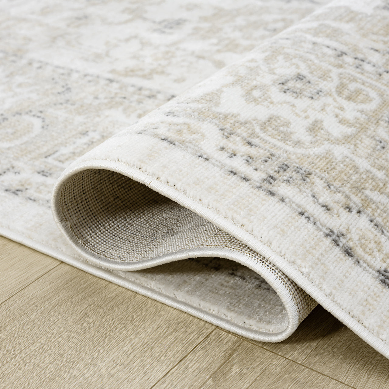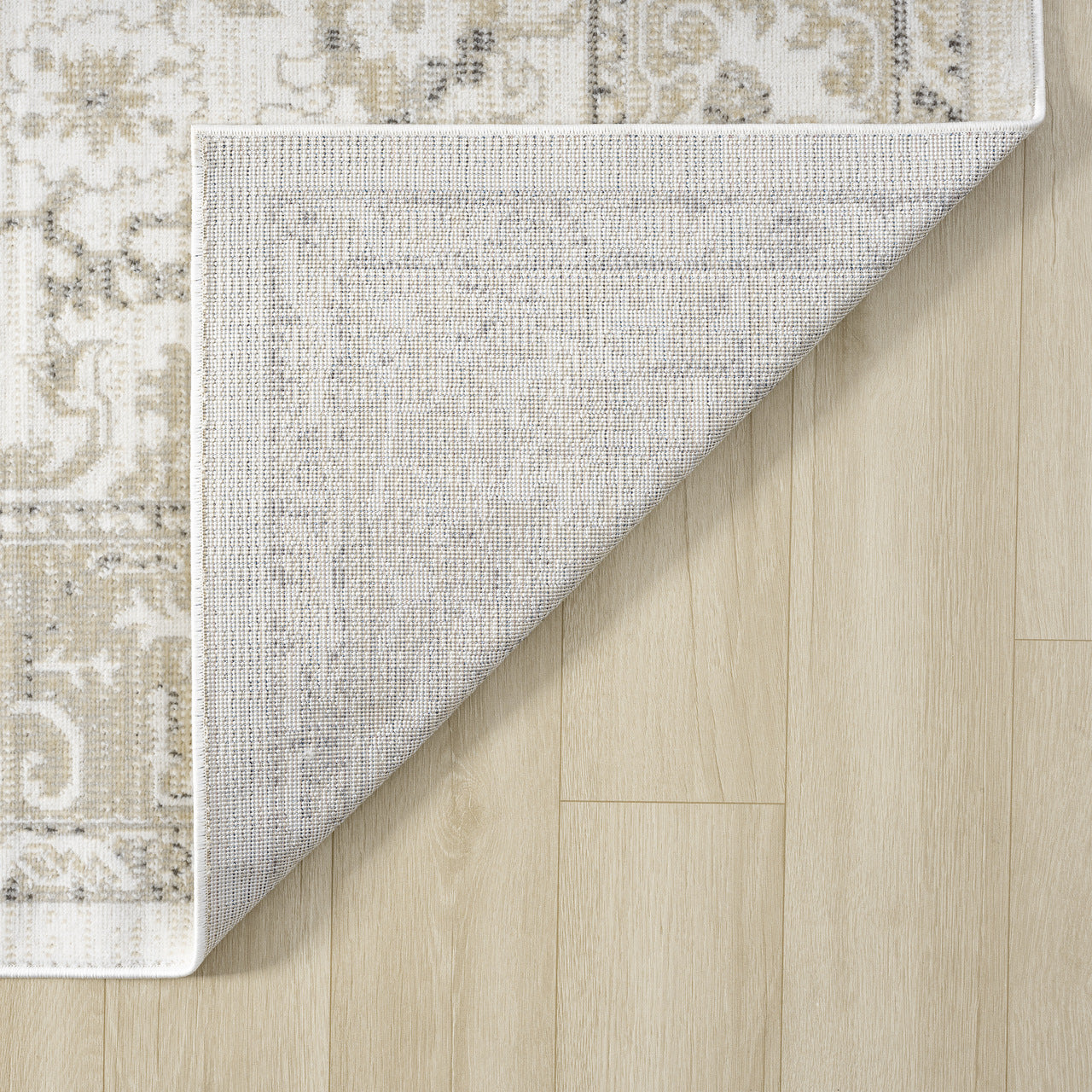 Dress your space with this area rug featuring an intricate ivory medallion surrounded by a delicate botanical border. Woven in durable, fade-resistant fibers, this medallion rug withstands wear and fading. Ideal for formal living rooms or dining areas, it delivers timeless elegance and simple maintenance.