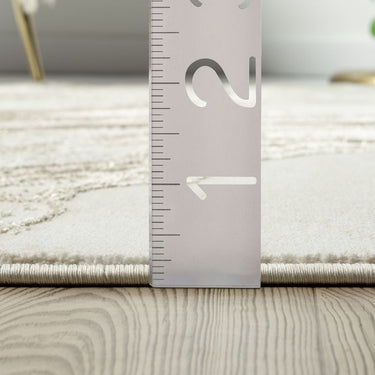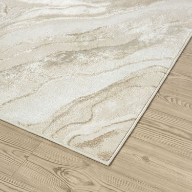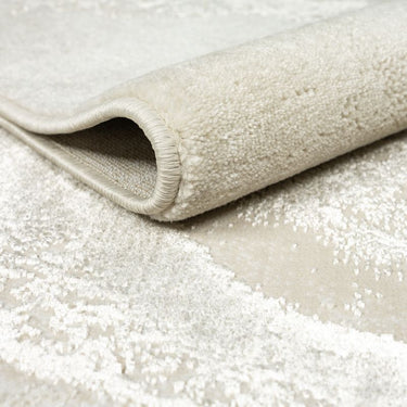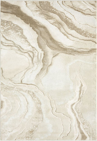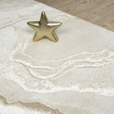 A stunning masterpiece in beige and cream with elegant brass highlights. This rug features an abstract pattern reminiscent of cut stone, adding a touch of natural sophistication to any room. Crafted with high-quality materials, this soft and timeless piece effortlessly blends style and luxury.