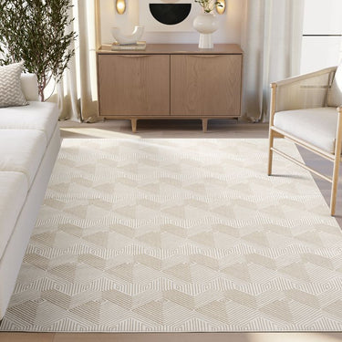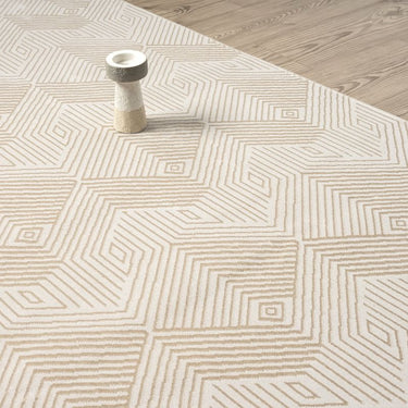 Discover the seamless blend of style and functionality with our cream and beige rug, featuring an interlocking geometric cube design. This tone-on-tone piece adds a sophisticated touch to any room, while its durable construction ensures it stands up to the busiest households. Kid and pet-friendly, this rug promises easy maintenance and lasting beauty, making it an ideal choice for spaces where daily life unfolds.