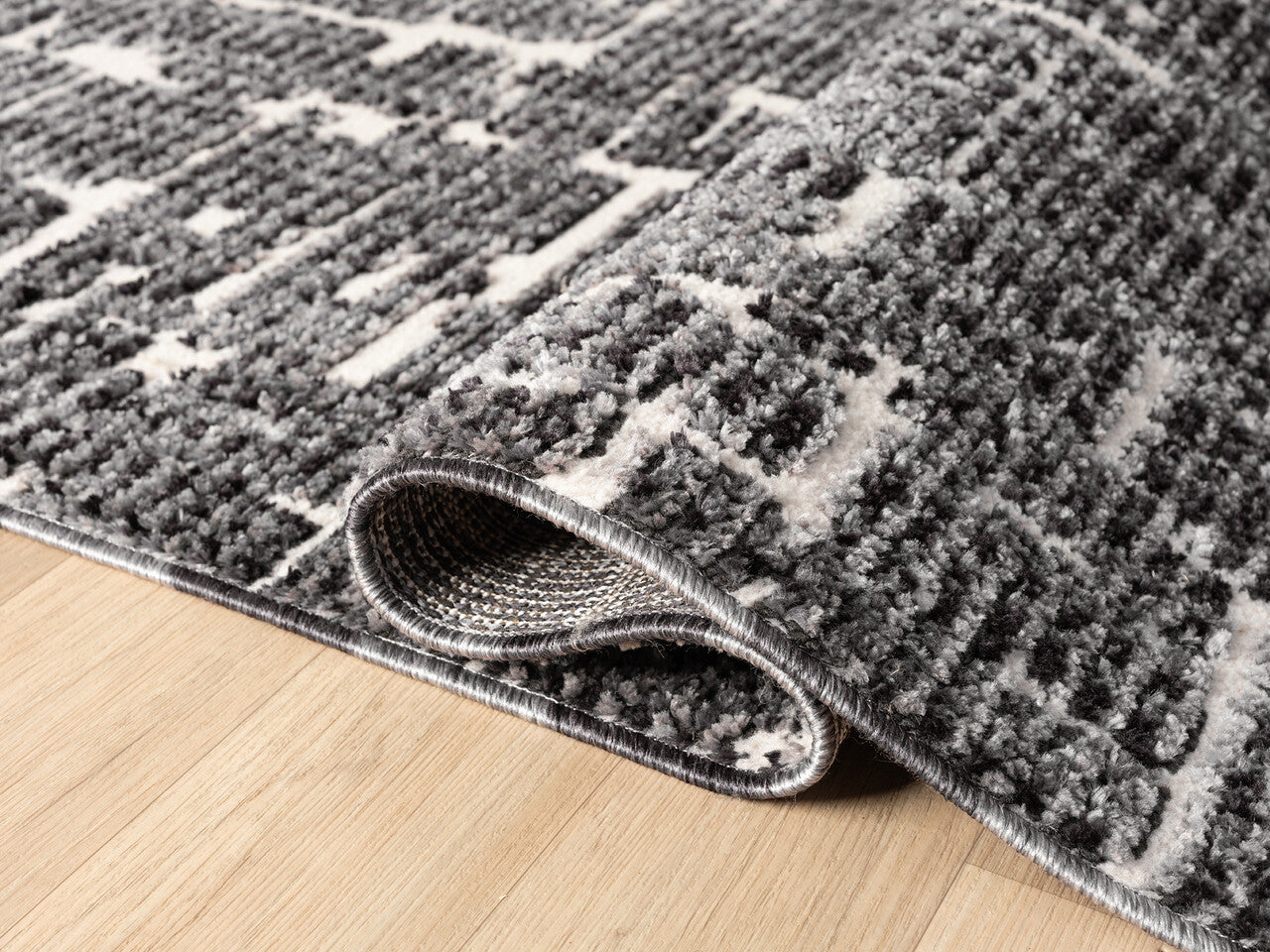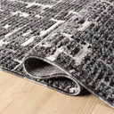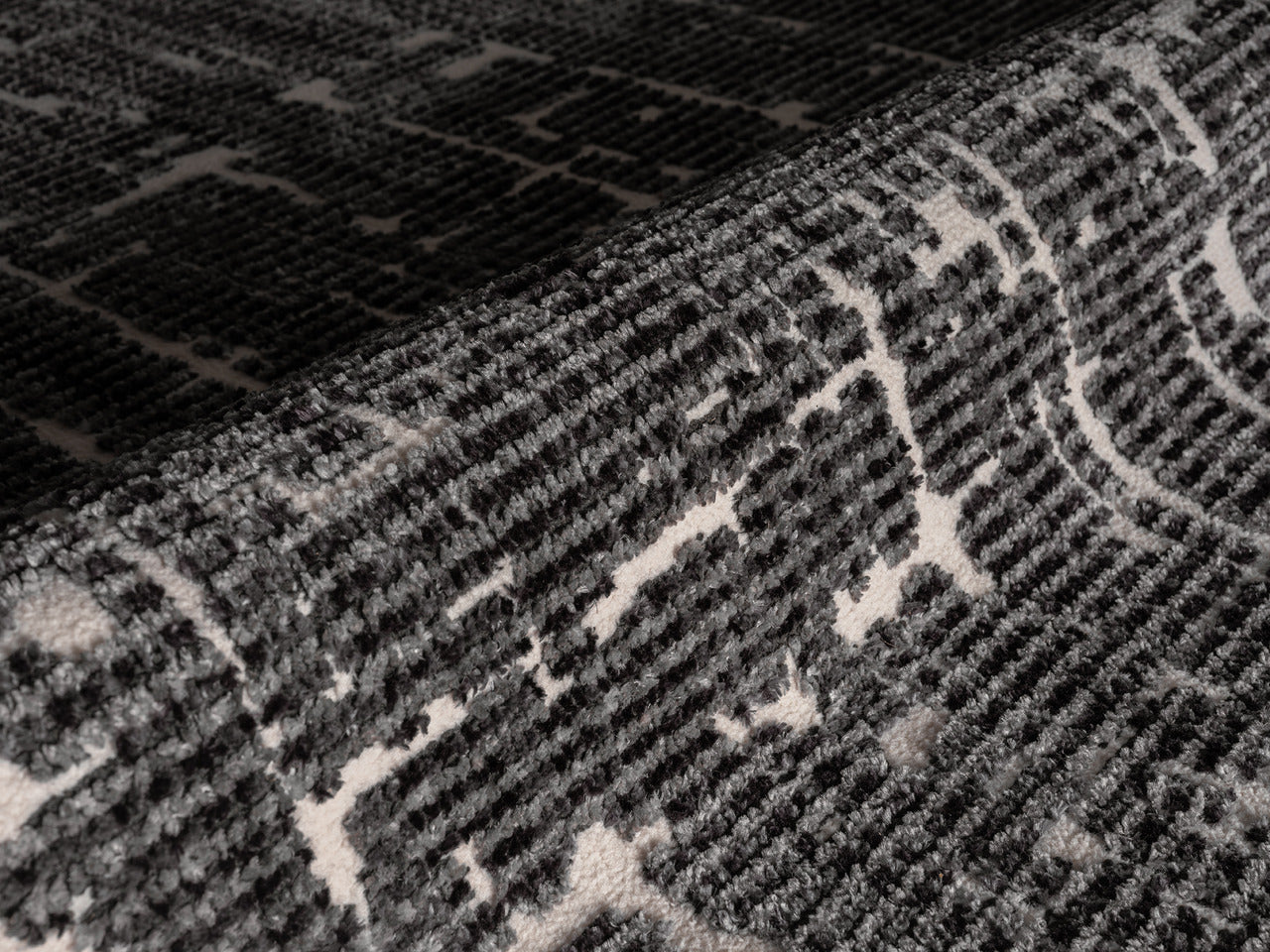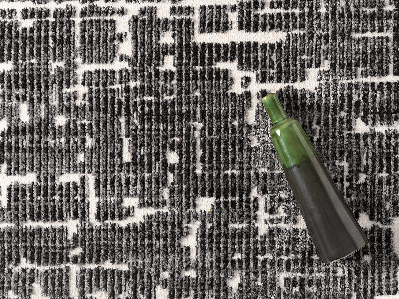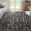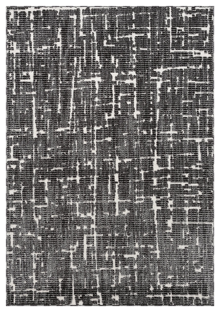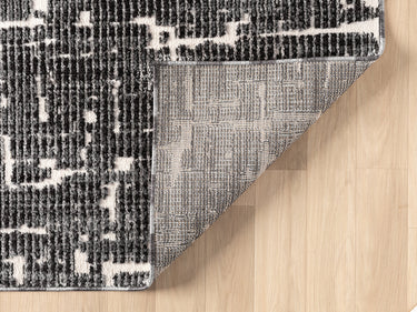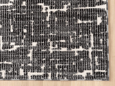 Striking and contemporary, this area rug features a bold abstract pattern in black and ivory. The layered, textured design evokes an urban sophistication, making it an ideal statement piece for modern living rooms, home offices, or open-concept spaces. Crafted for both style and durability, it brings refined edge and visual depth to any interior.