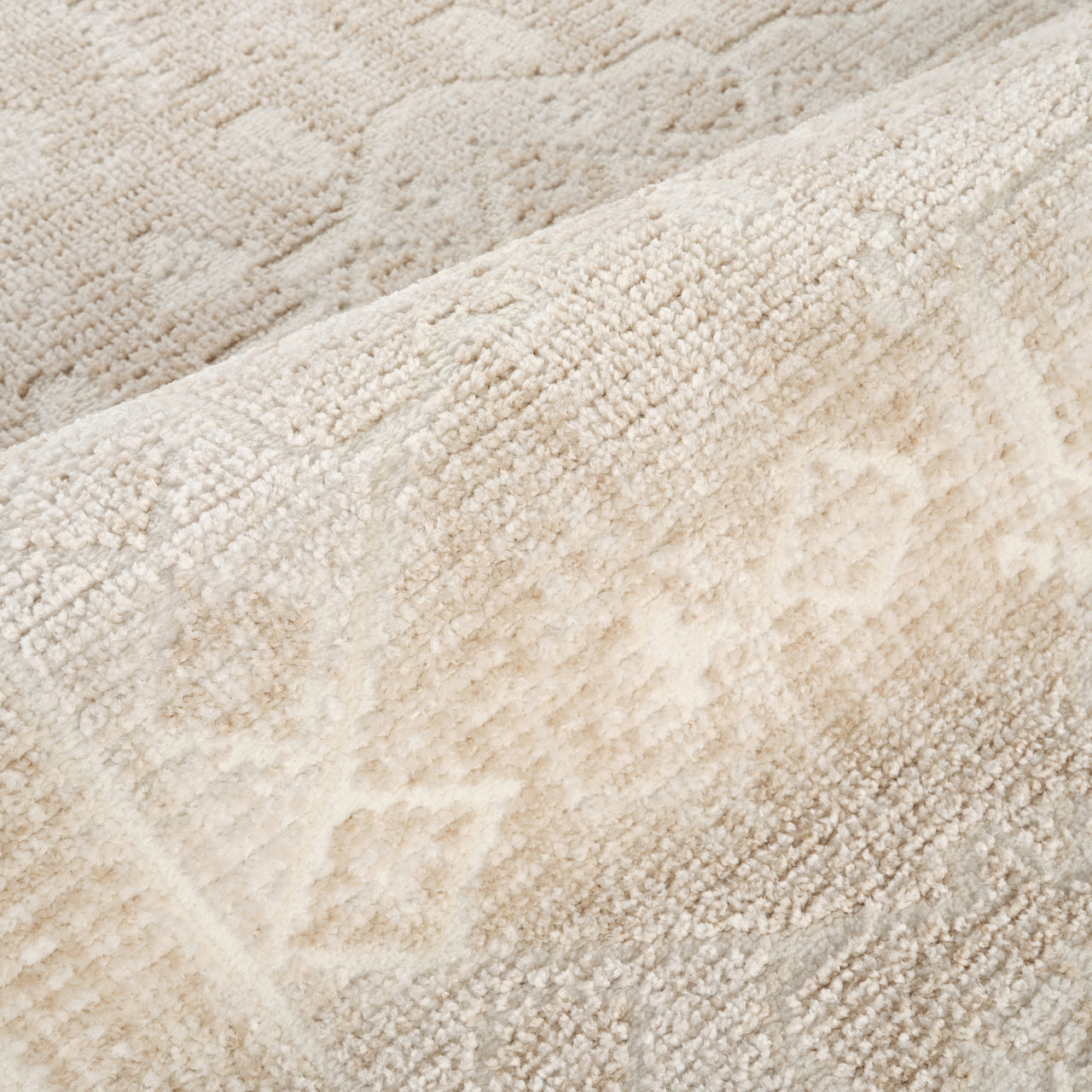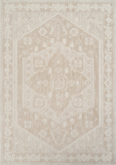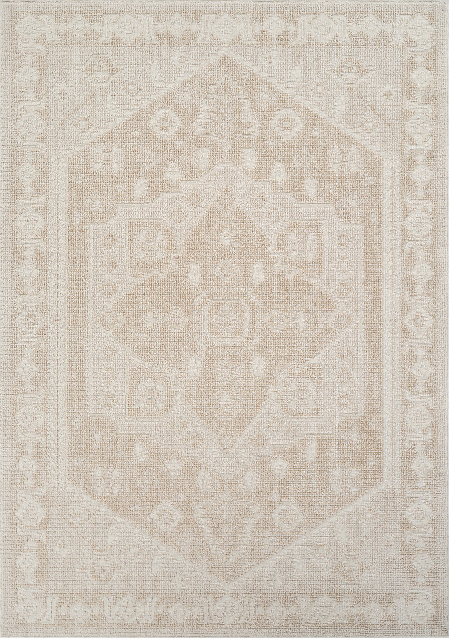 Understated yet elegant, this area rug features a gently faded medallion pattern in soft beige and ivory tones. The tonal design adds subtle texture and depth, creating a versatile foundation that complements both classic and contemporary spaces. Ideal for living rooms, bedrooms, or dining areas, it brings a touch of timeless sophistication with a modern, minimalist edge.