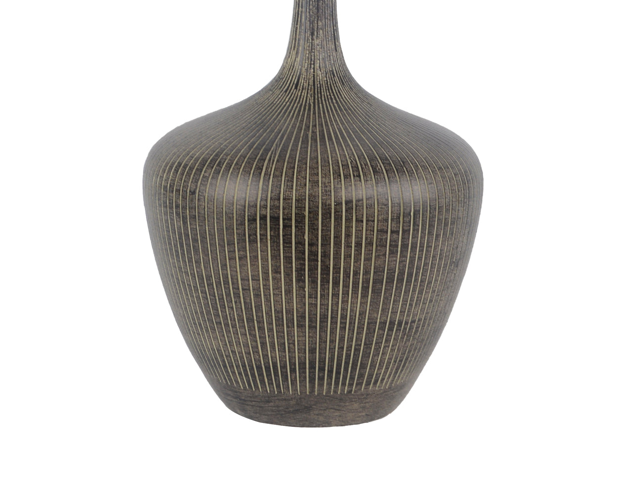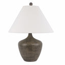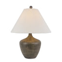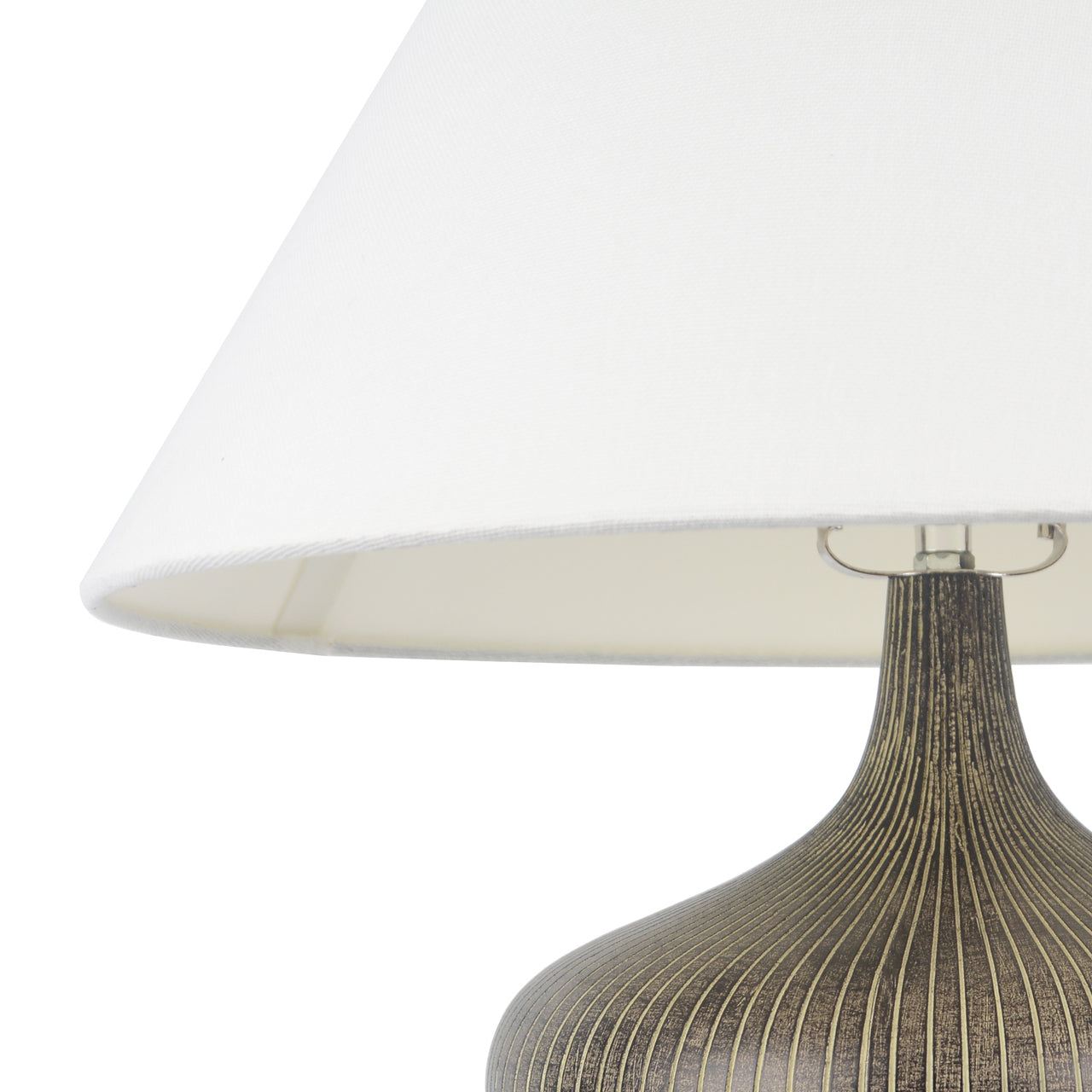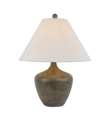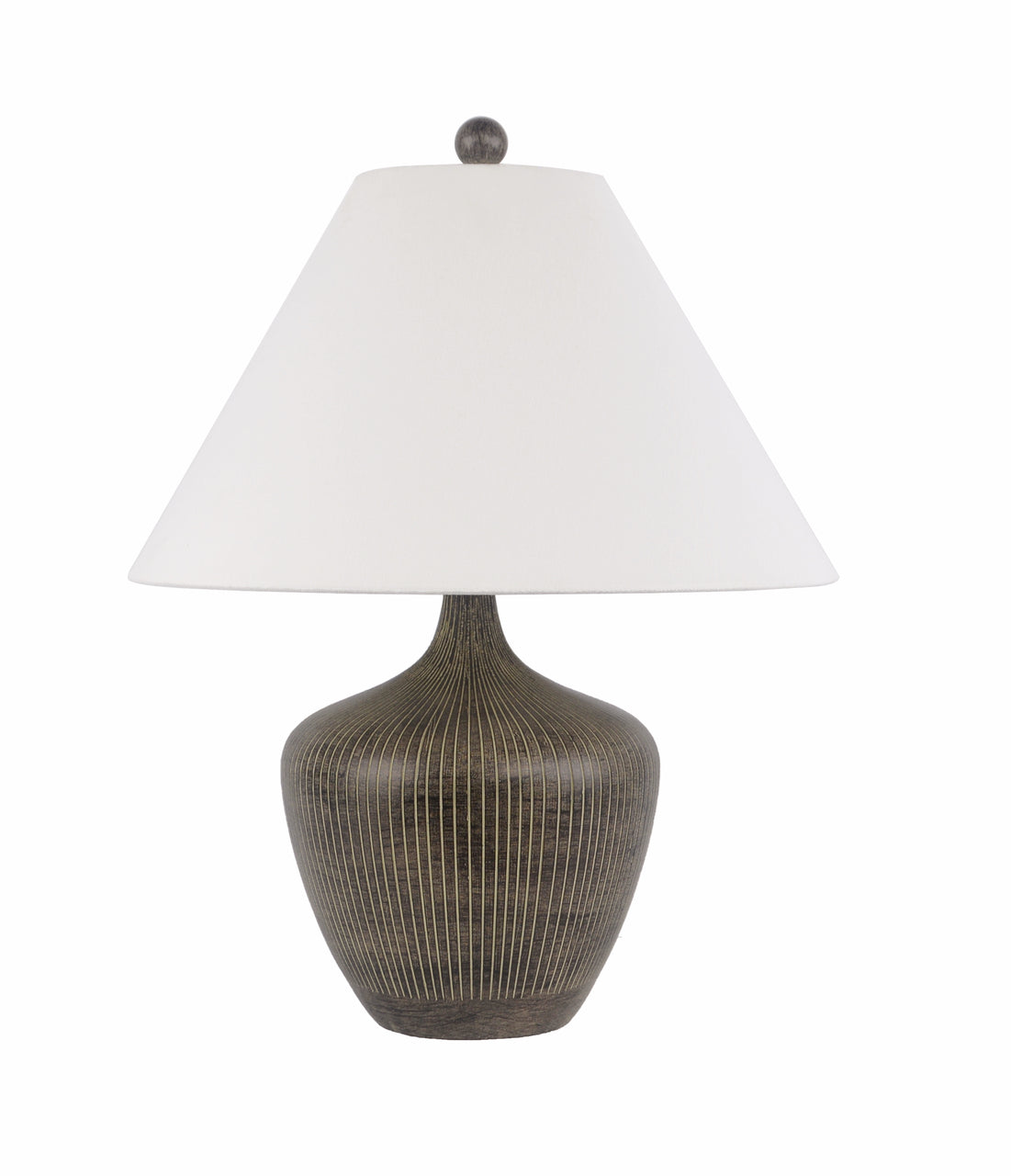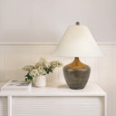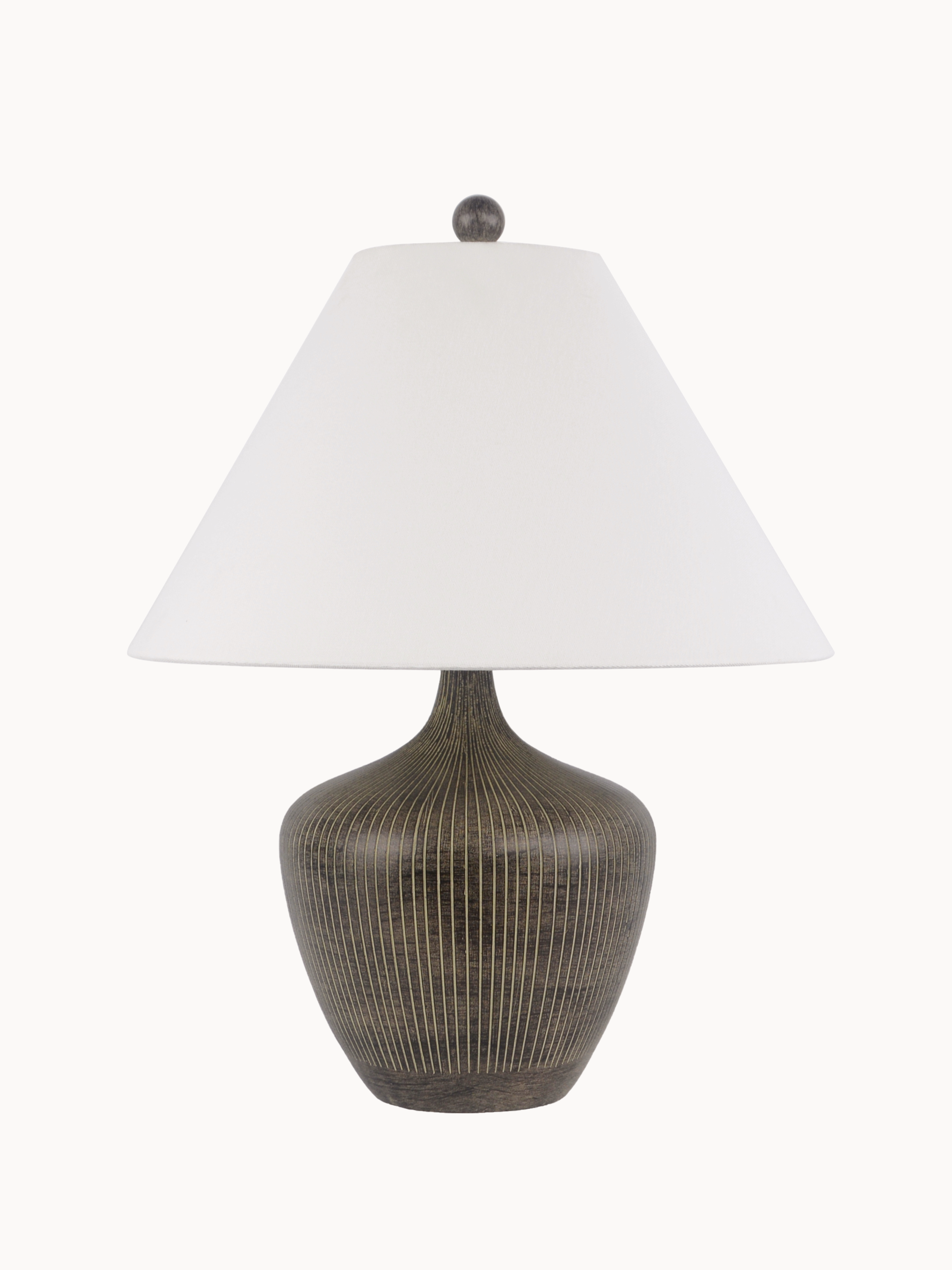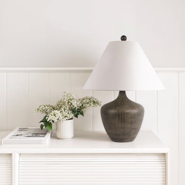 Gracefully tapered in a vase-inspired shape, the base features subtle linear detailing that adds depth and texture. Earthy tones pair effortlessly with the classic white cone shade, casting a warm, welcoming glow for traditional and transitional spaces alike.