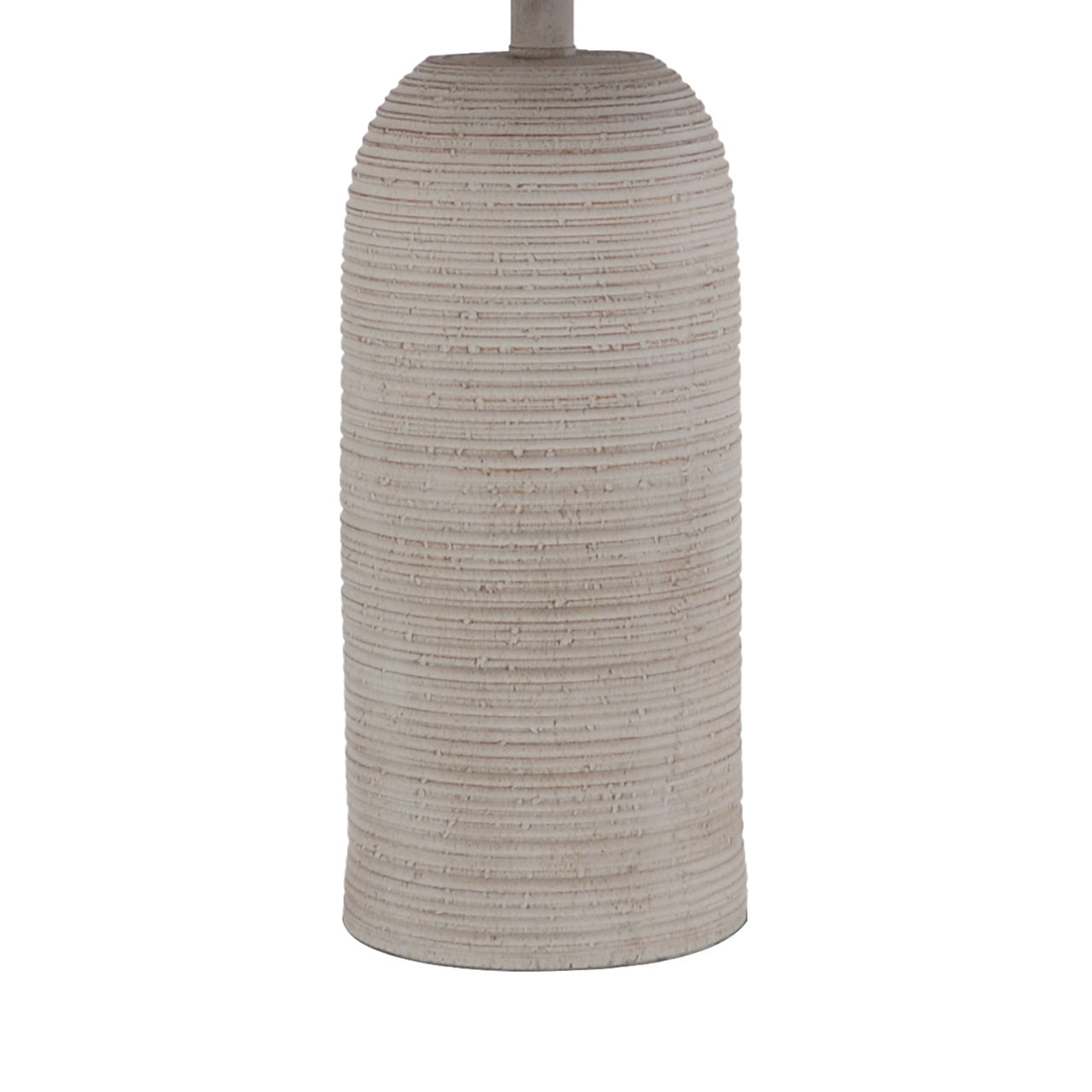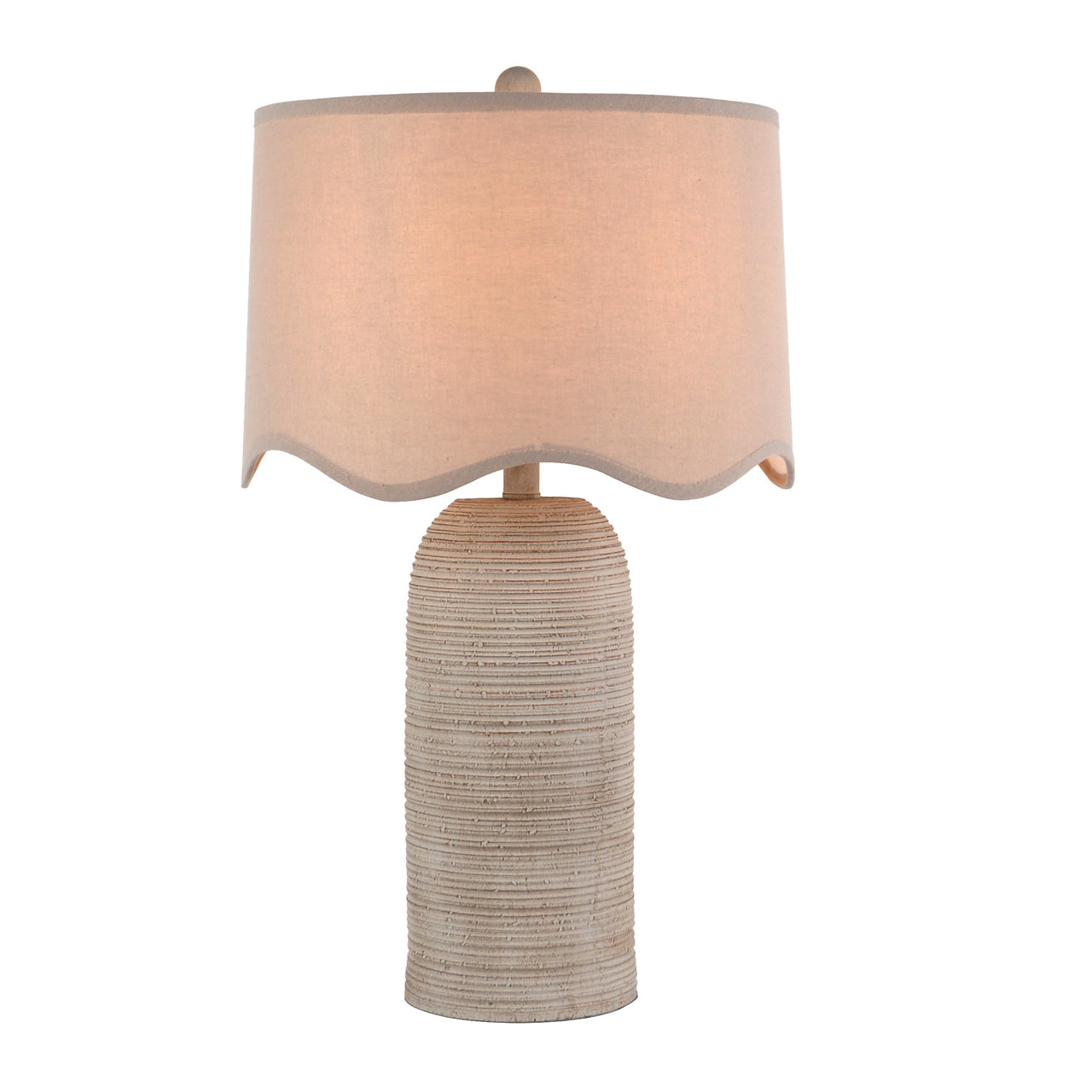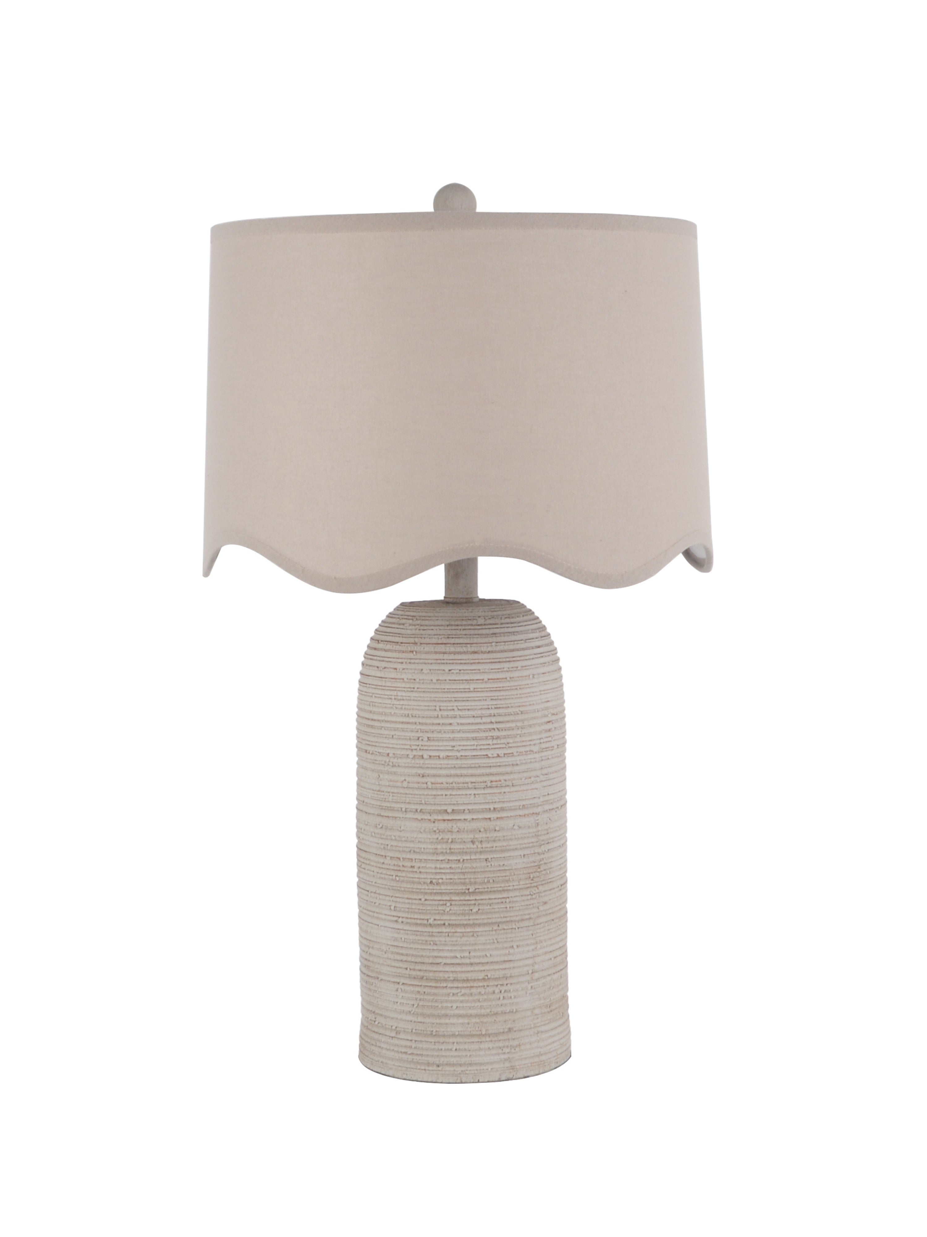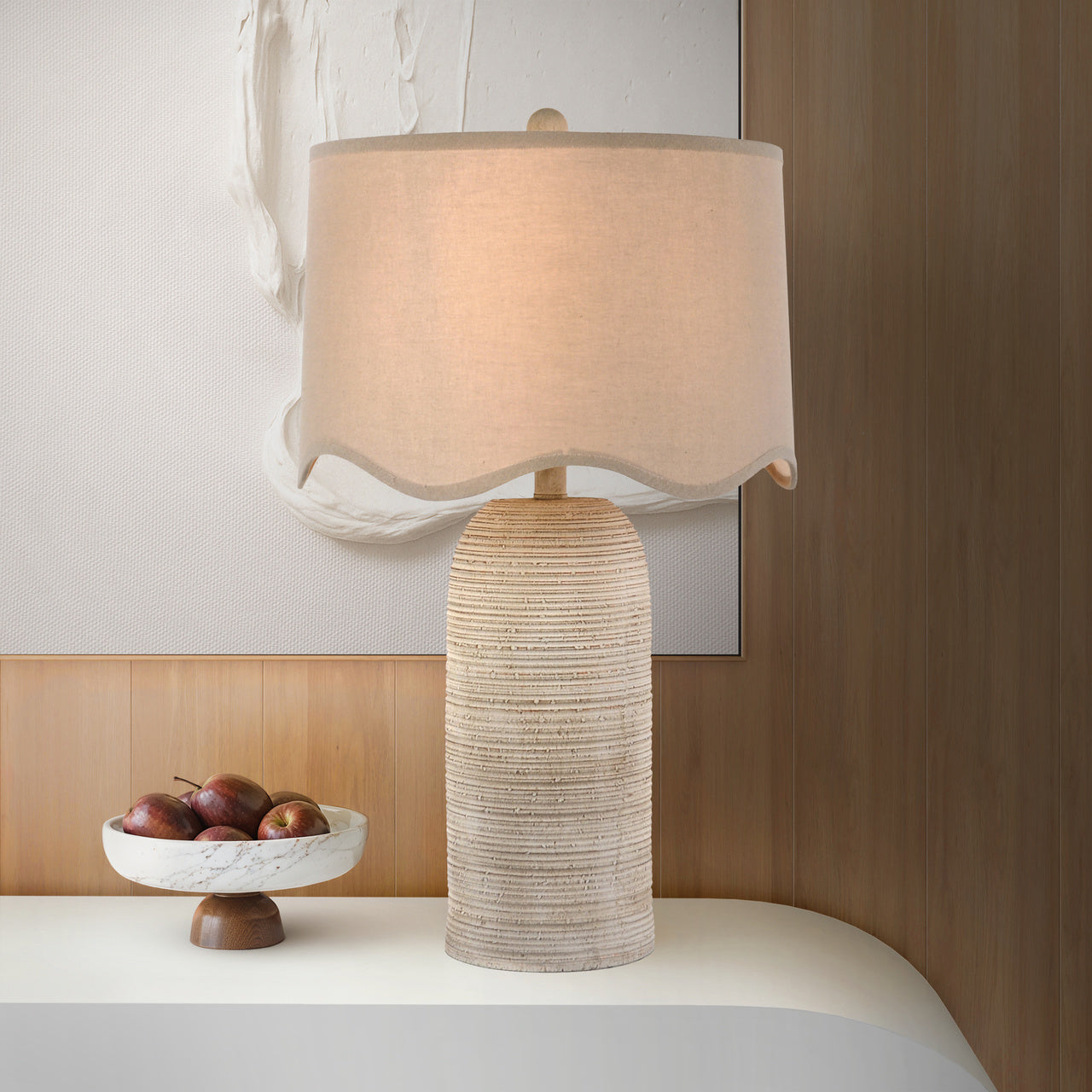 A tall, textured base in a soft, weathered finish pairs beautifully with a unique wavy-edged shade for a playful yet refined look. Its neutral palette and sculptural silhouette make it a versatile statement piece, adding warmth and charm to any room.