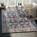 Keep your room looking classic and comfortable with a traditional rug that oozes sophistication. Your company will be floored by the stunning purple, ivory, and red floral motif that is repetitive both on the inside and along the thick border. Not only is the red and purple colored motif beautiful, but it stands out exceptionally well against the classic vibrant blue colored background of the rug.