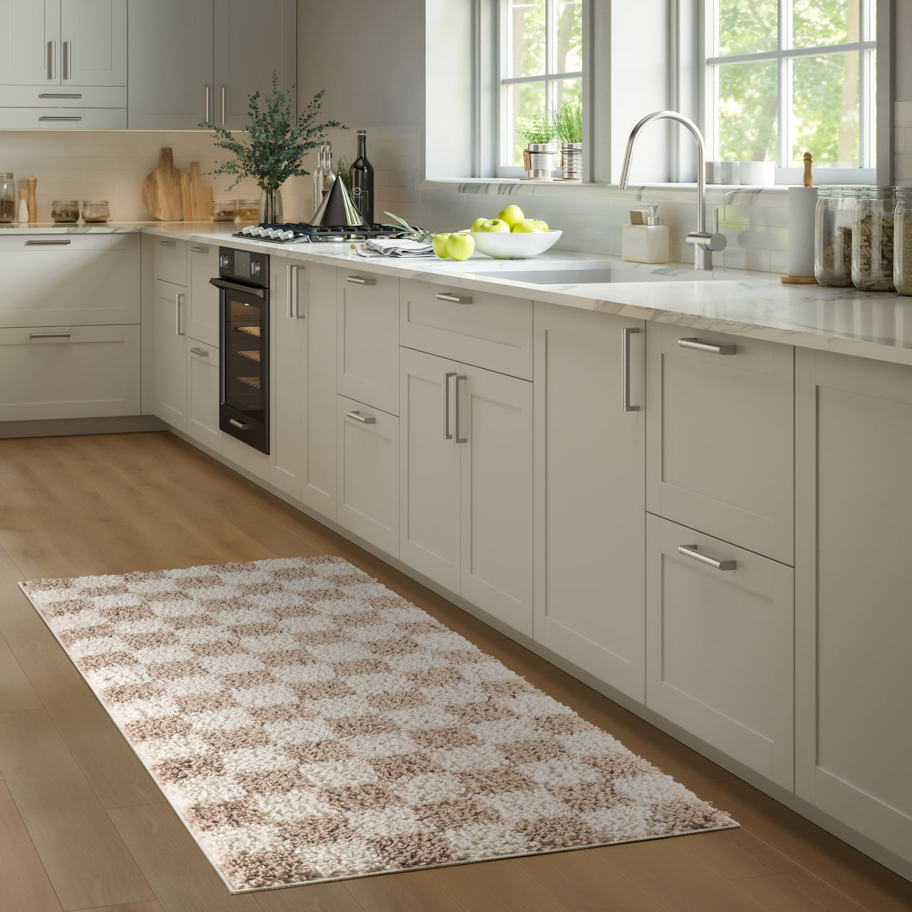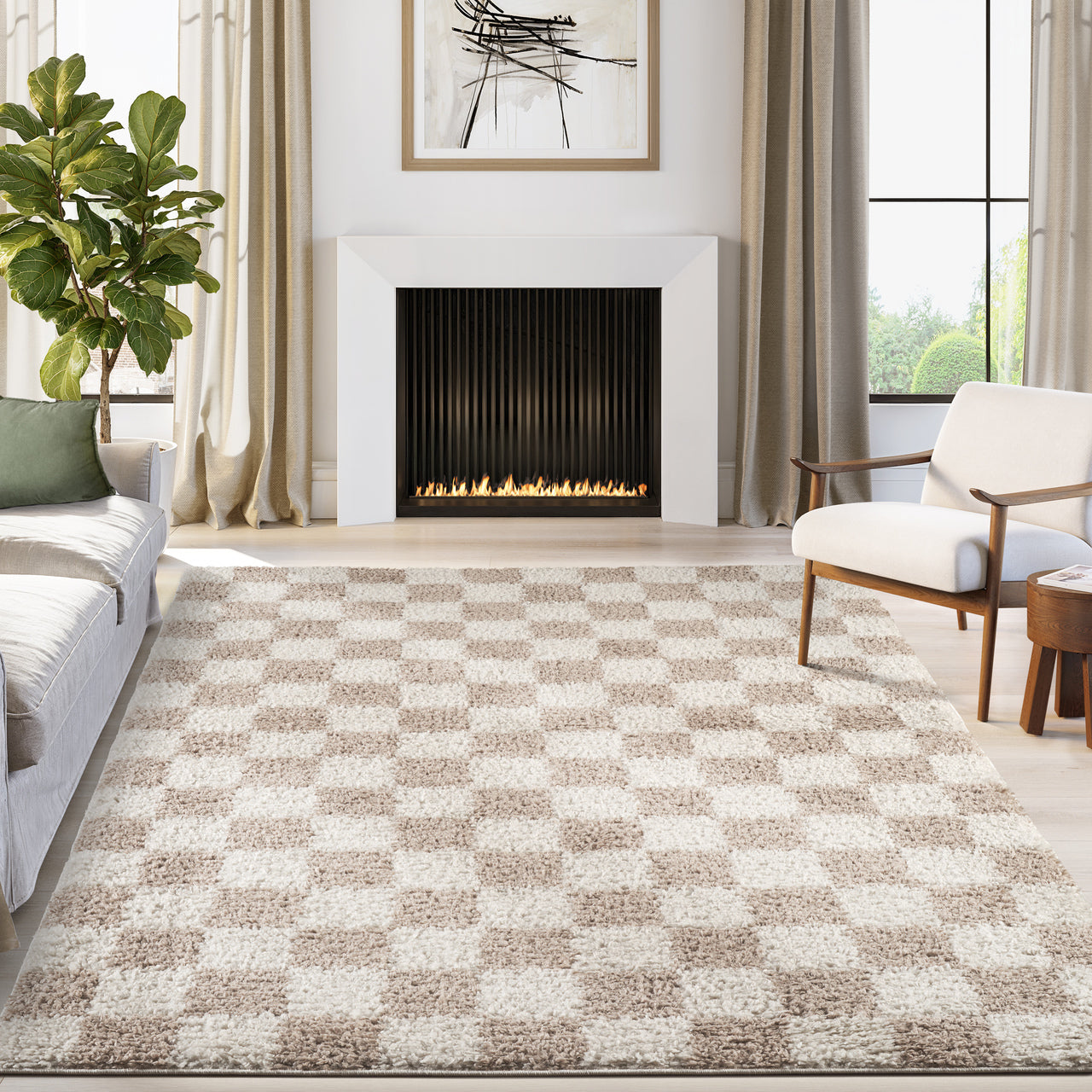 Soft, stylish, and playfully modern, this shag area rug features a classic checkered pattern in warm beige and ivory tones. The plush, high-pile texture offers cozy comfort underfoot, making it an inviting addition to bedrooms, nurseries, or casual living spaces. With its bold pattern and touchable softness, this rug effortlessly blends comfort with contemporary design.