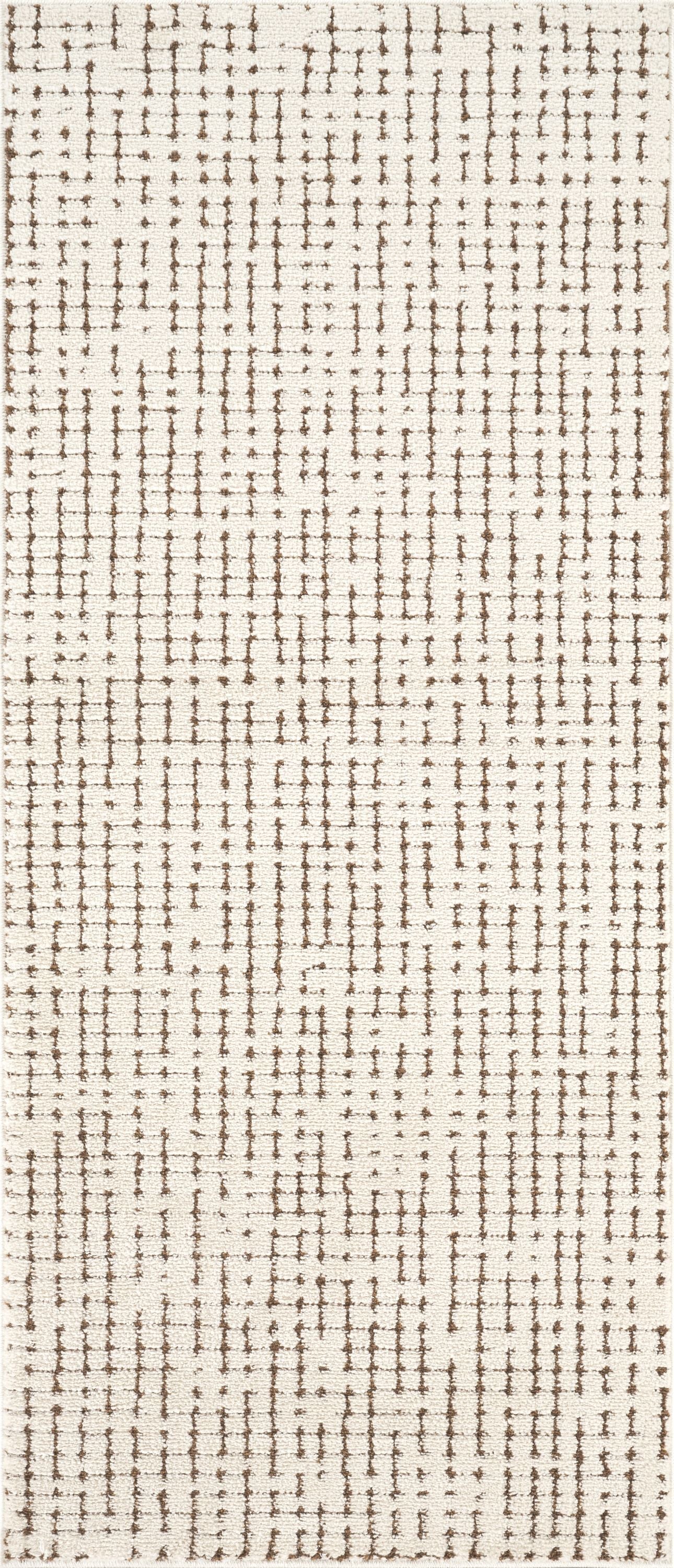 This modern area rug features a soft cream base with a subtle crosshatch pattern in warm brown, creating a textural, woven effect. The minimalist design adds visual interest without overpowering the space, making it perfect for neutral interiors, Scandinavian styles, or contemporary living. Ideal for grounding bedrooms, living rooms, or cozy reading nooks with a touch of quiet sophistication.