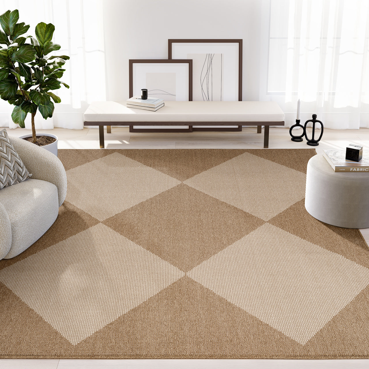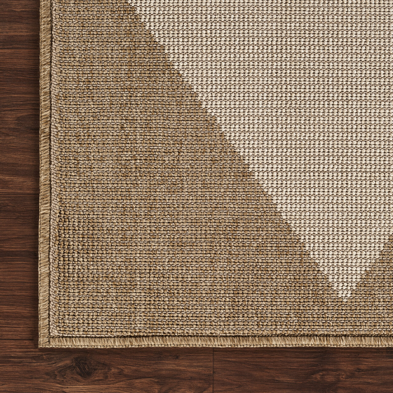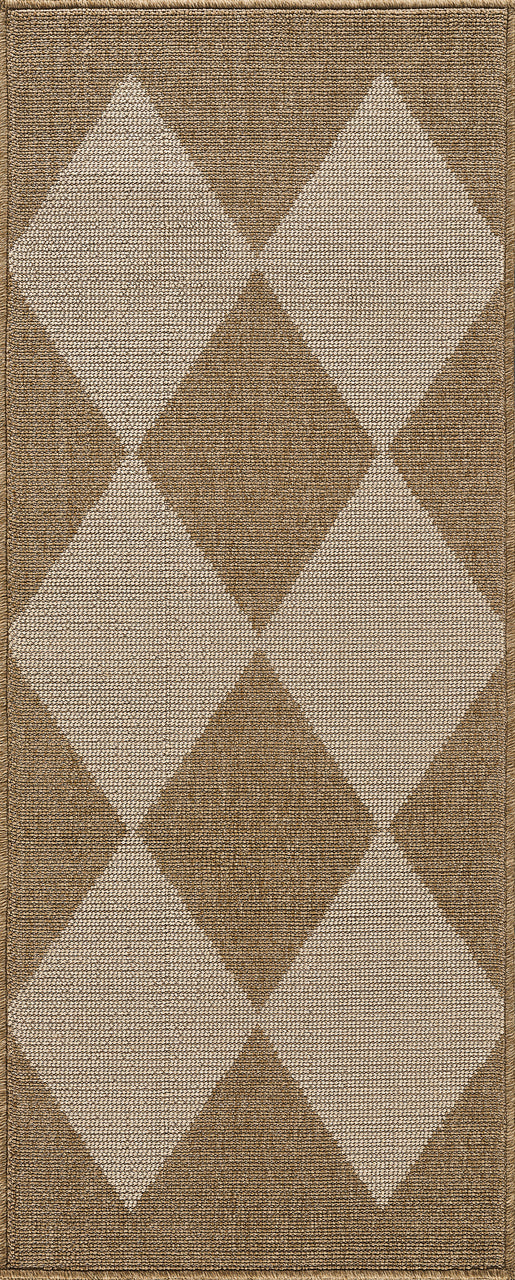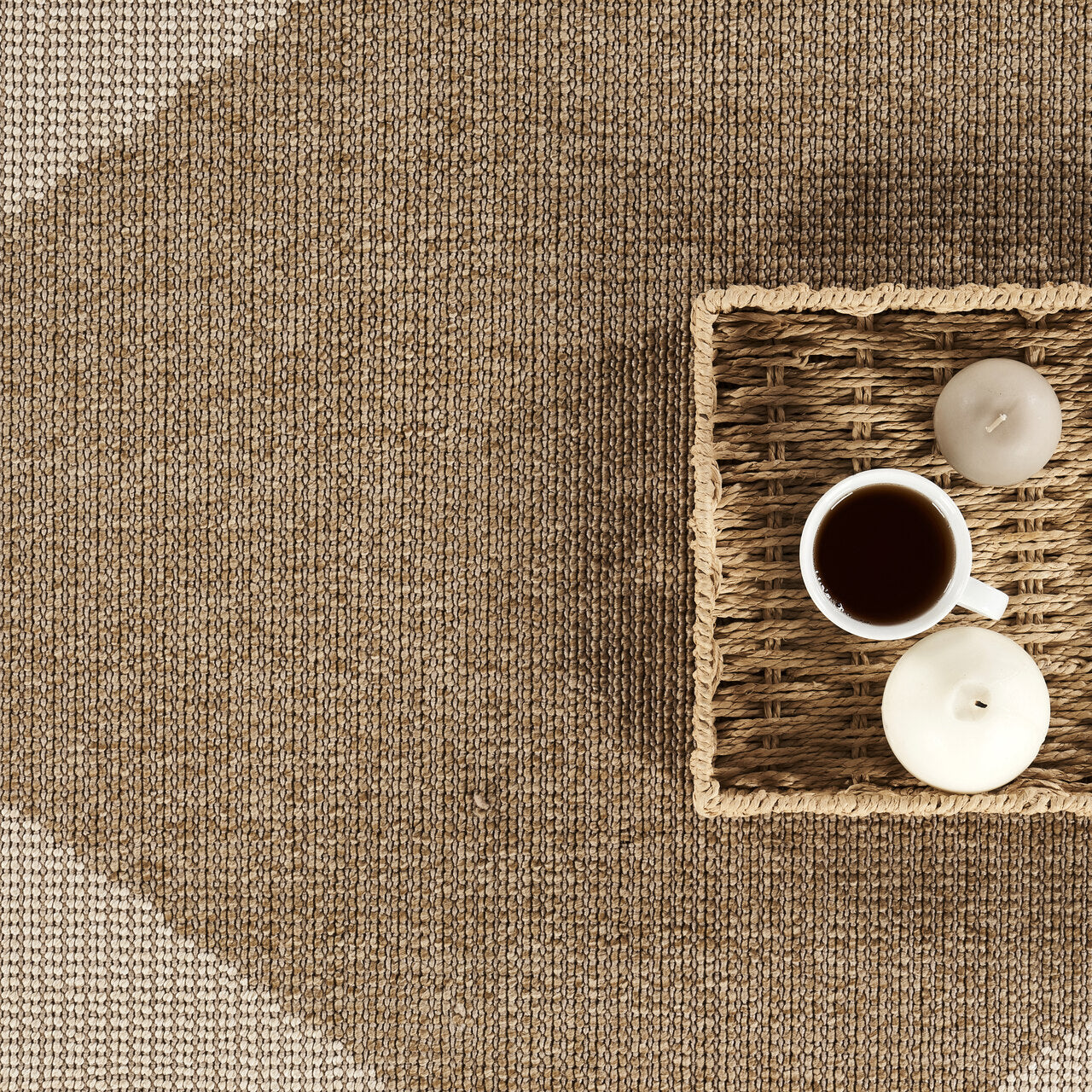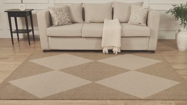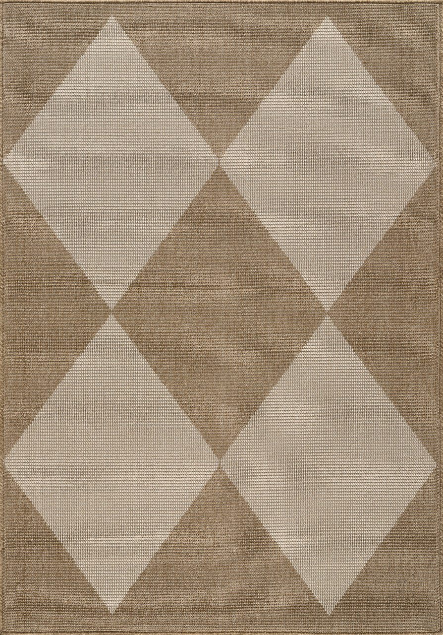 Modern geometry meets natural texture in this eye-catching diamond motif. The large-scale pattern offers a bold visual statement, while the soft neutral tones and woven detail bring warmth and refinement. Perfect for grounding open spaces or defining outdoor seating areas, this rug combines durability with modern sophistication—made to complement relaxed, design-forward living.