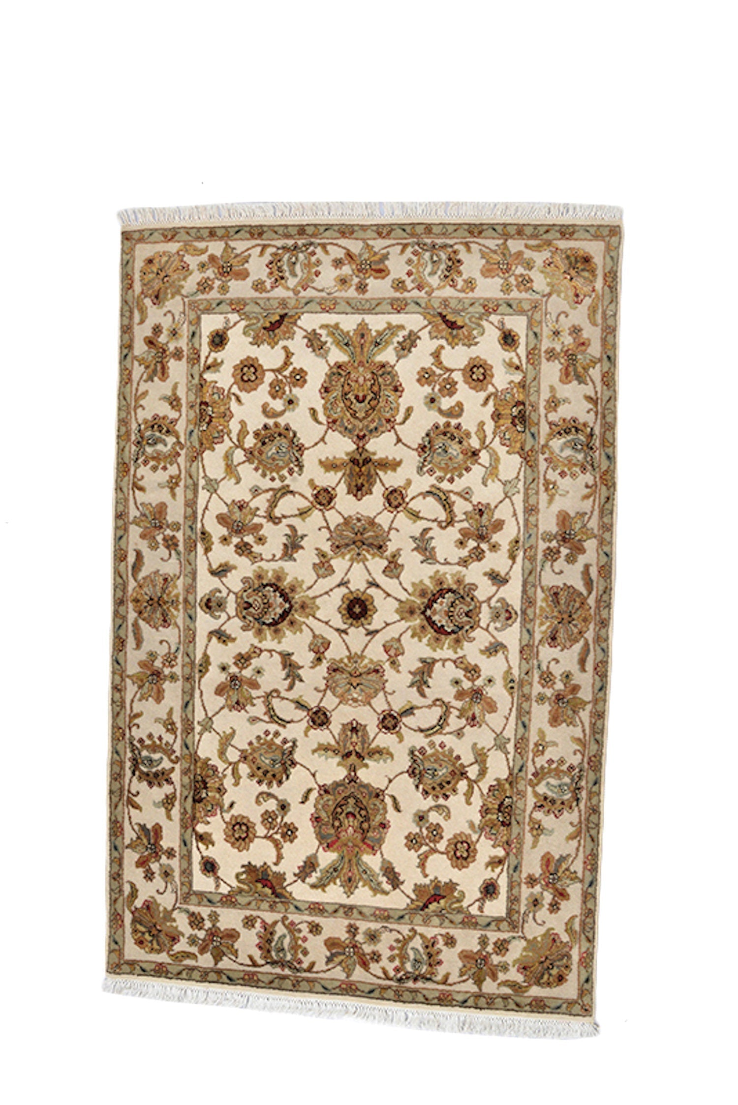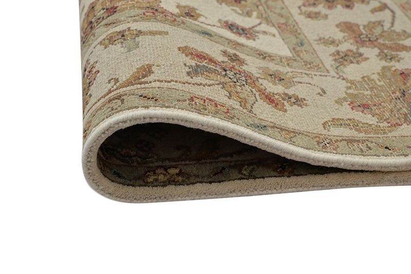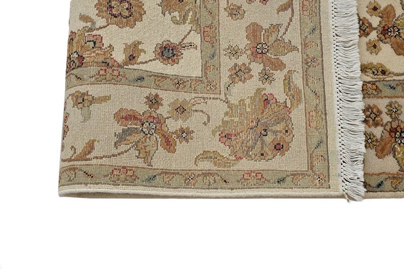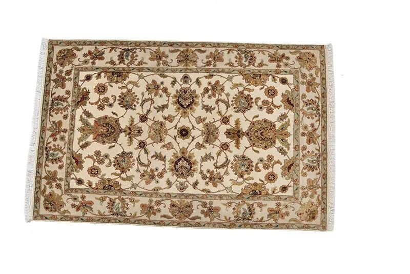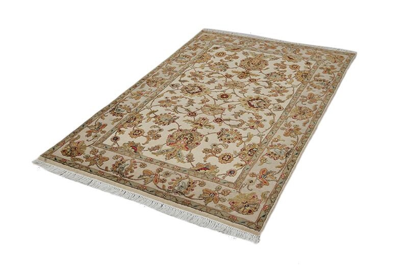 It measures 5'10" x 4'1" and features a floral and vine motif in warm earth tones of ivory and beige. The center of this soft wool rug features floral medallions as the focal point.