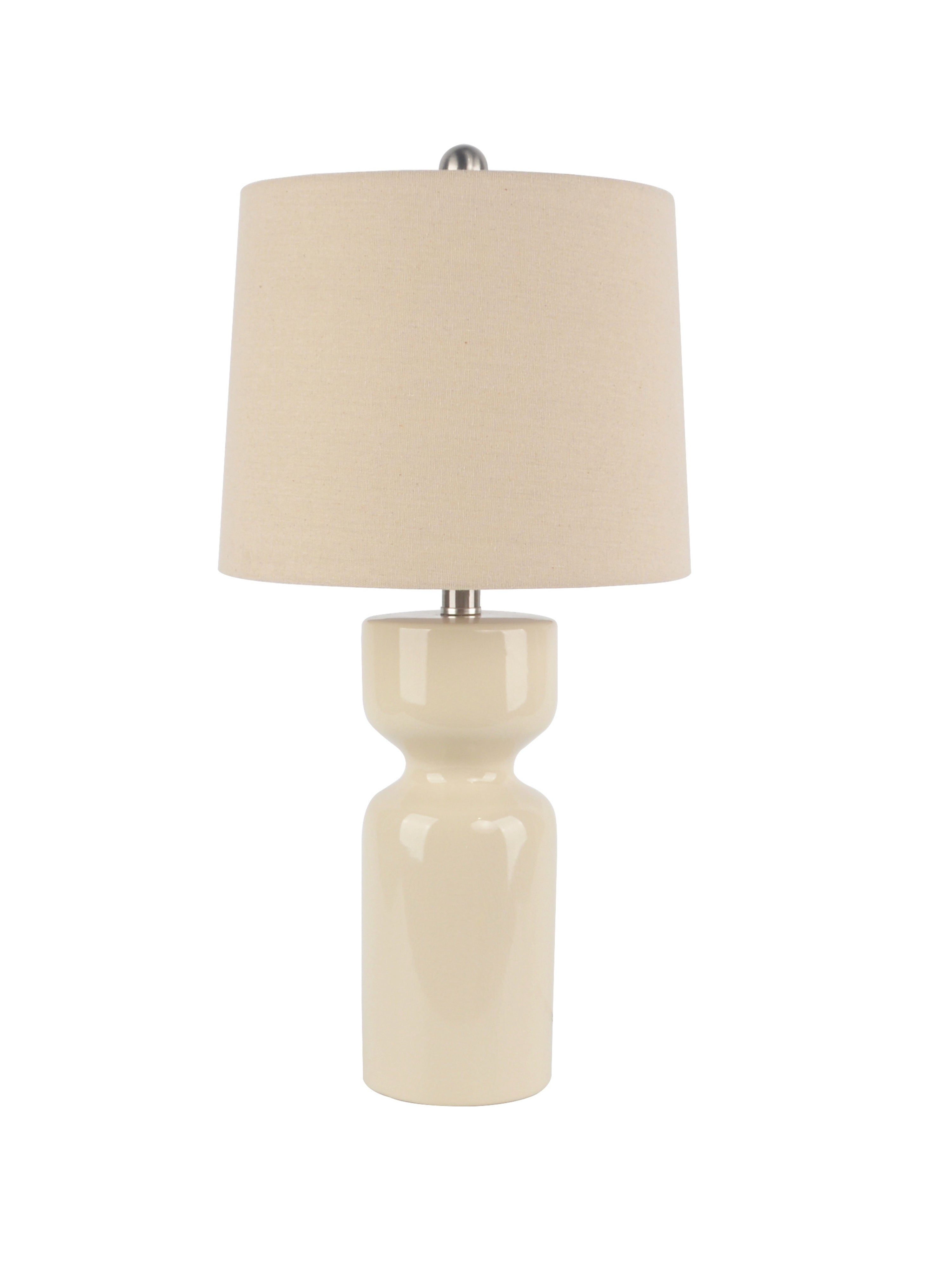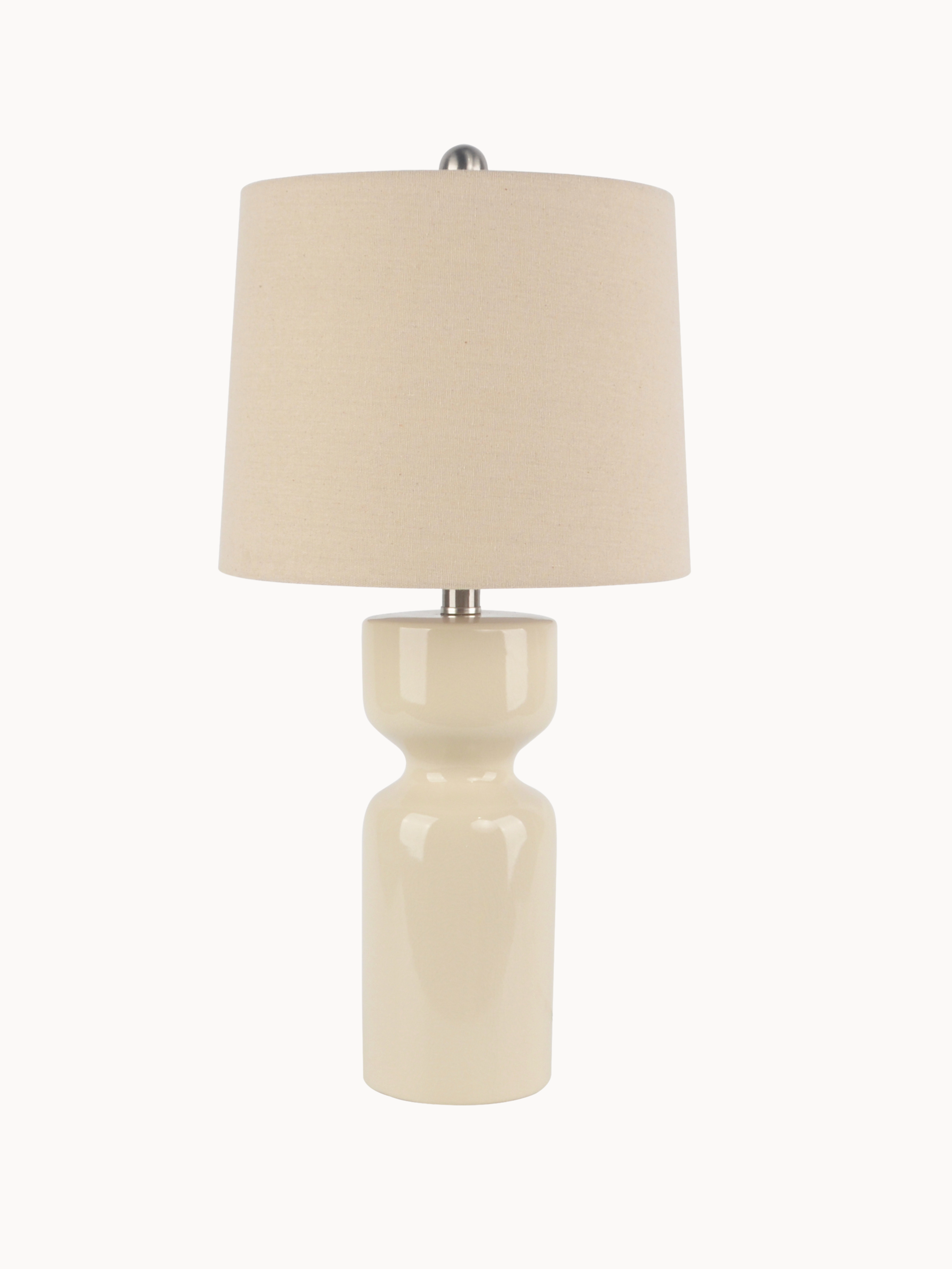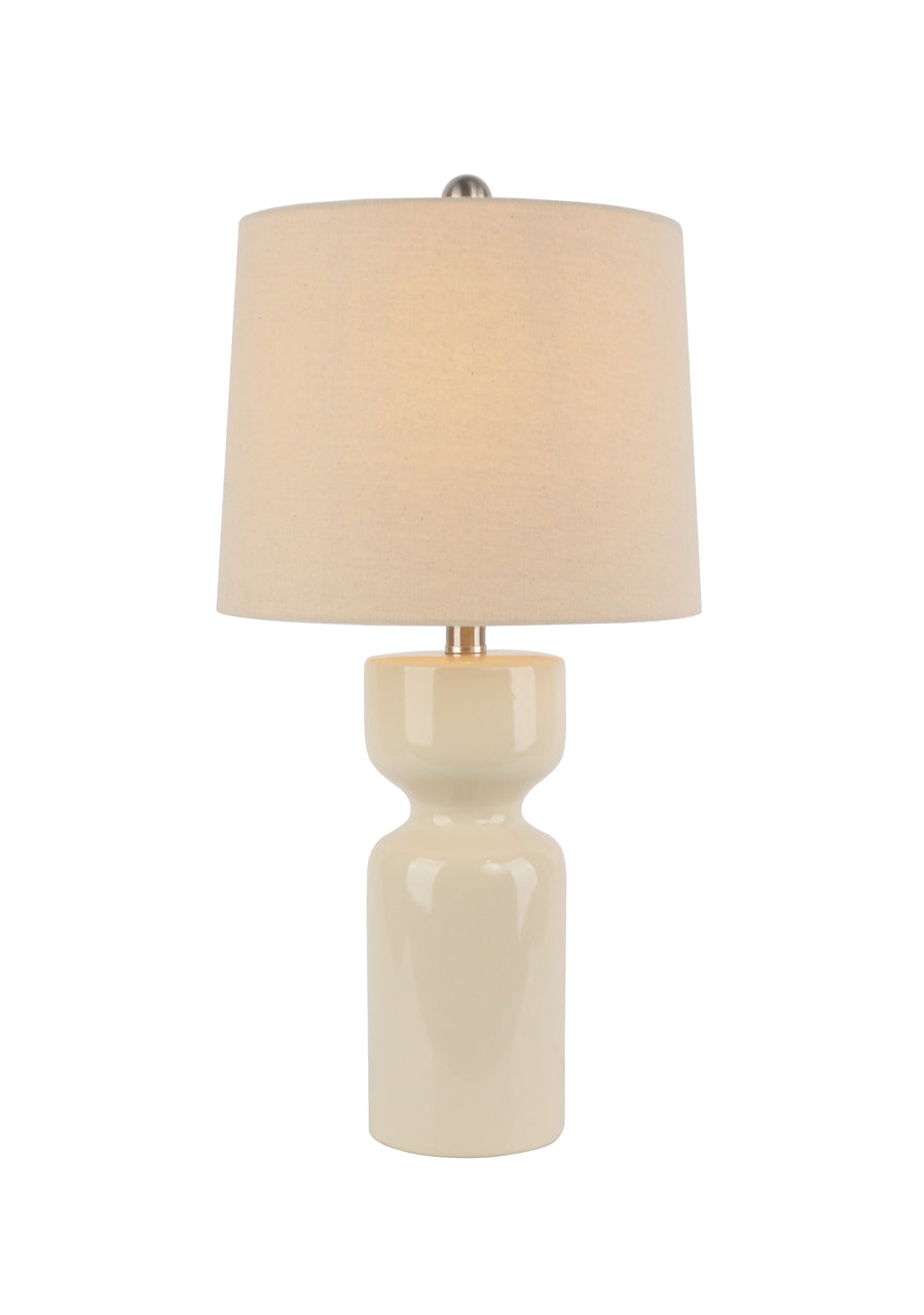 Sculpted with a smooth, high-gloss finish, the cylindrical base features a subtle waist detail that adds modern elegance. The soft neutral tone pairs effortlessly with a matching fabric shade, bringing a clean, polished look to living rooms, bedrooms, or entryways.