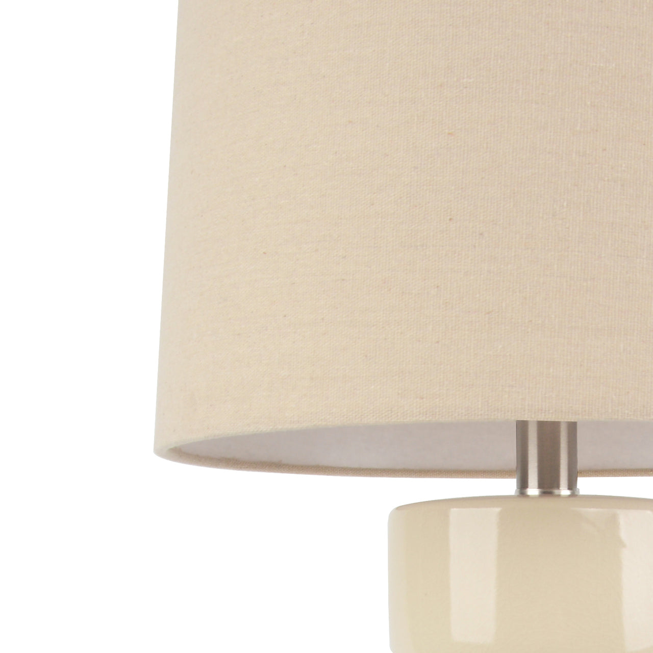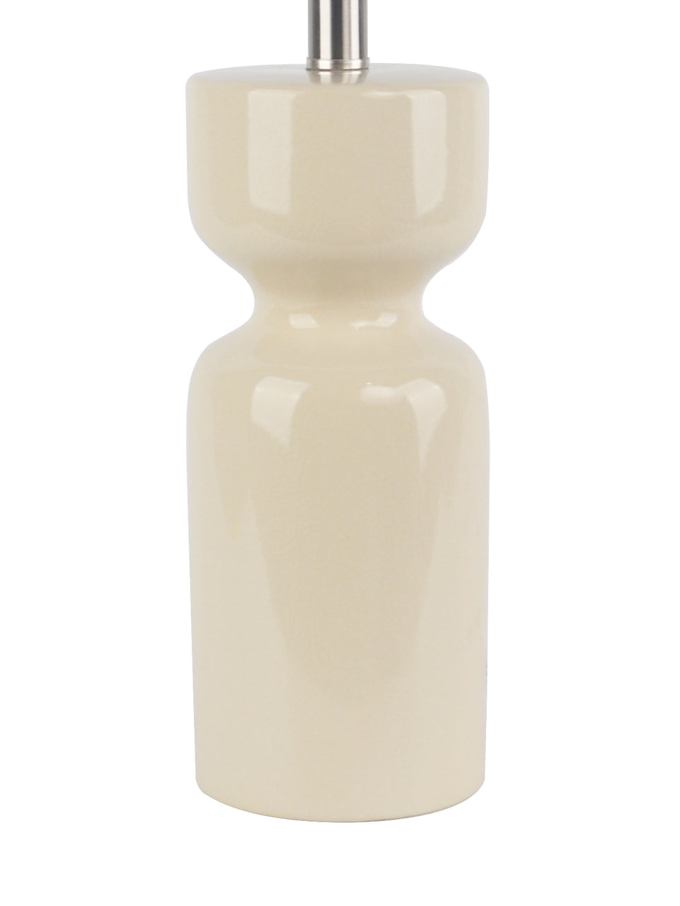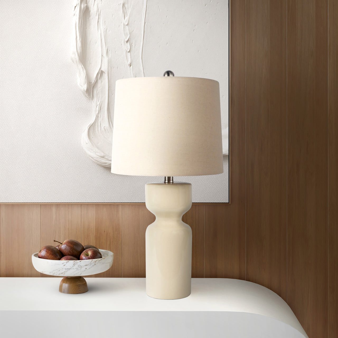 Sculpted with a smooth, high-gloss finish, the cylindrical base features a subtle waist detail that adds modern elegance. The soft neutral tone pairs effortlessly with a matching fabric shade, bringing a clean, polished look to living rooms, bedrooms, or entryways.