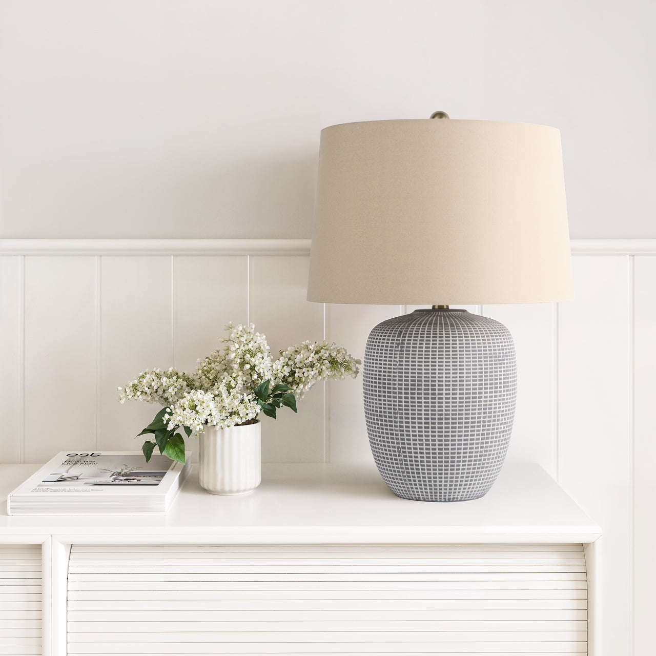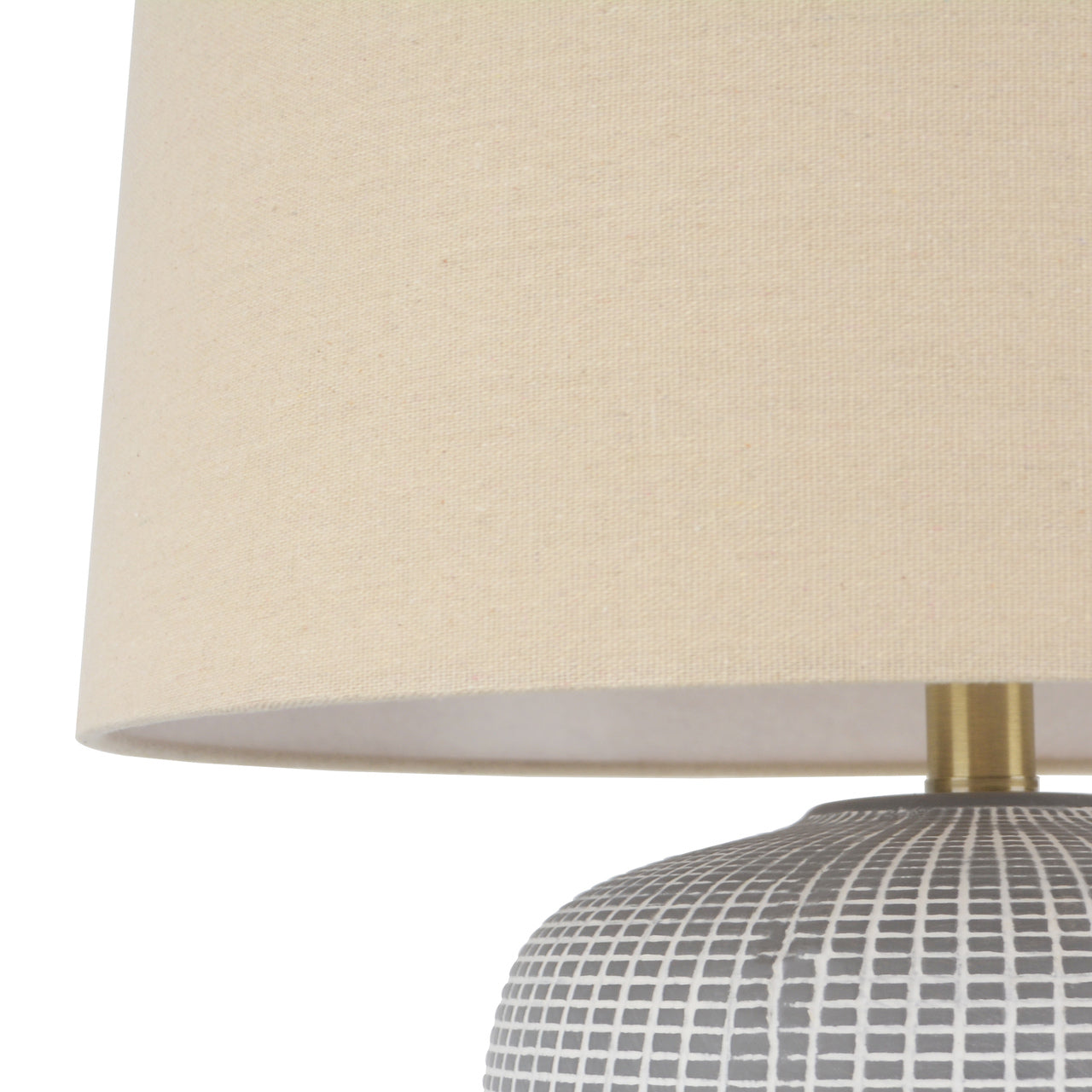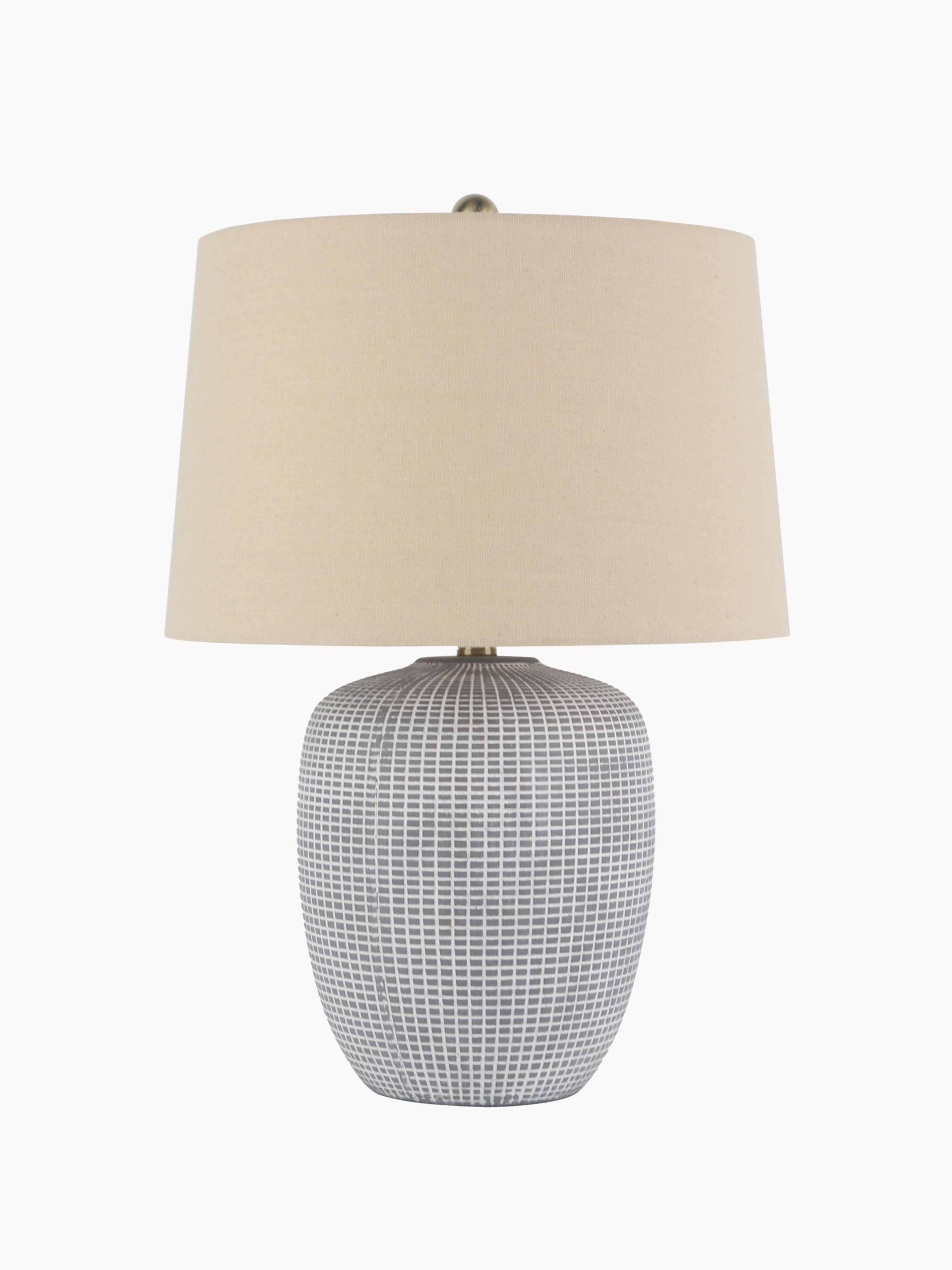 A rounded base with a subtle grid pattern gives this lamp a refined yet relaxed charm. The soft, neutral glaze pairs seamlessly with a natural linen shade, offering warm, inviting light that works beautifully in both modern and transitional spaces.