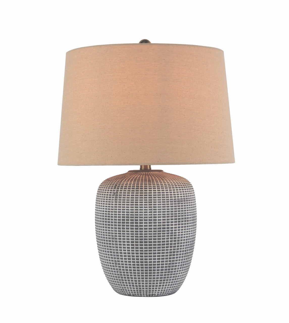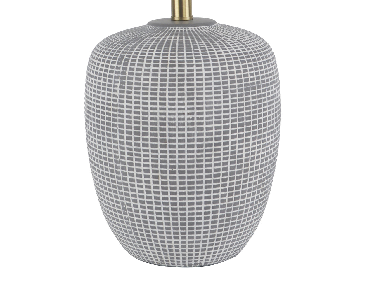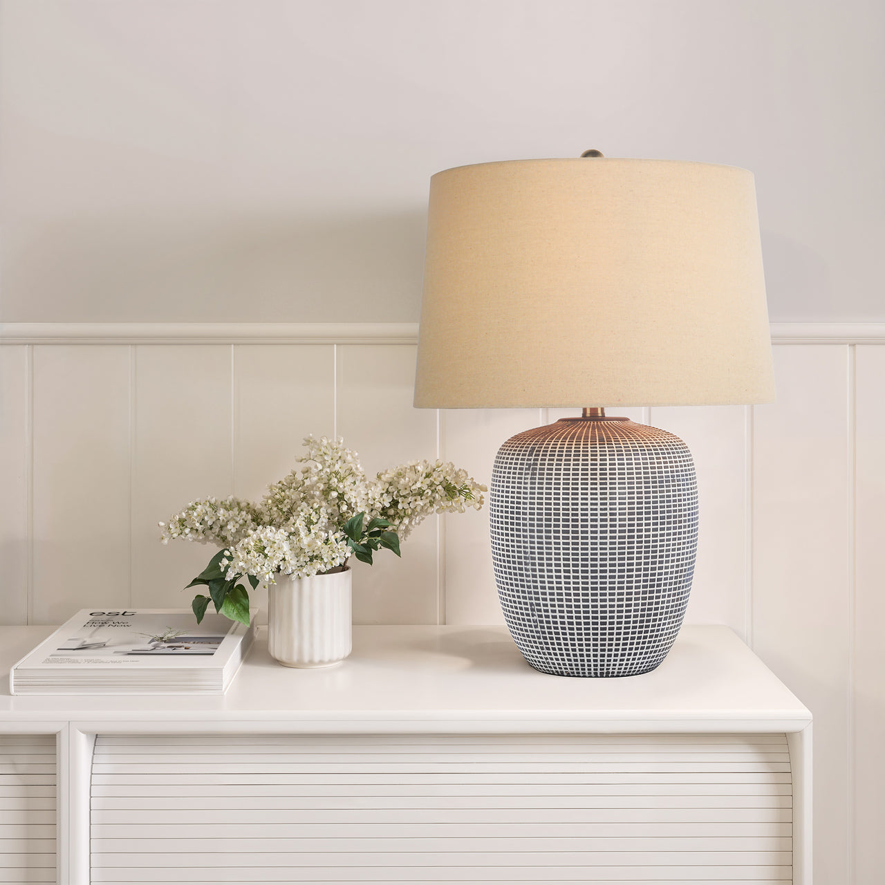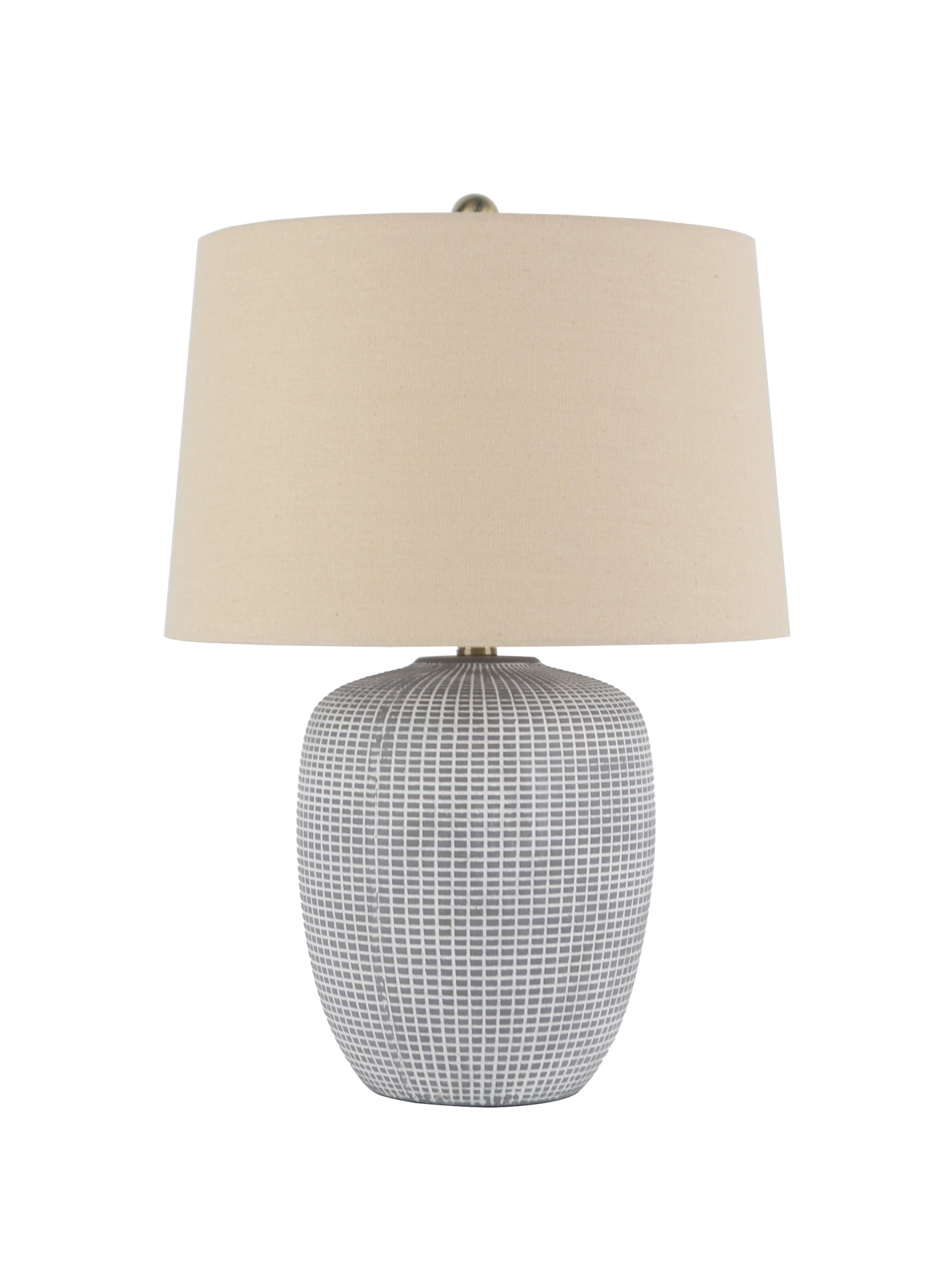 A rounded base with a subtle grid pattern gives this lamp a refined yet relaxed charm. The soft, neutral glaze pairs seamlessly with a natural linen shade, offering warm, inviting light that works beautifully in both modern and transitional spaces.