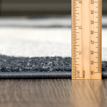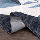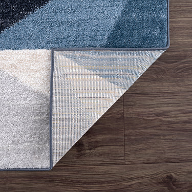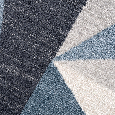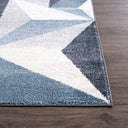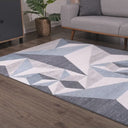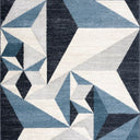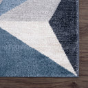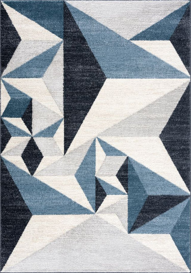 Art deco style rectangular area rug exhibiting a 3D triangle pattern suitable for any living space. Elevate a neutral grey room by adding a blue color accent. This rug has a soft texture underfoot and is sure to create a stylish space with its modern pattern.