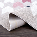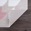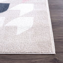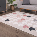 Inspired by the houndstooth pattern, this rendition includes an ivory colored houndstooth shapes on a beige background. Colored shapes of greys and pinks are also added throughout the design. Uplift your minimalist neutral space with this area rug and bring out the soft toned pinks in your decor elements.
