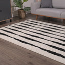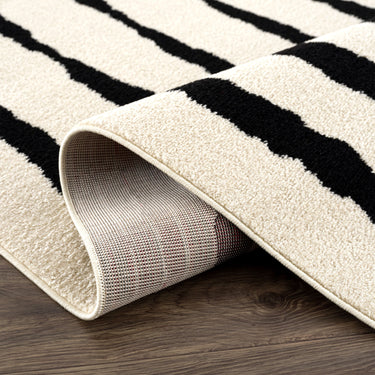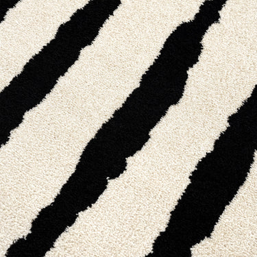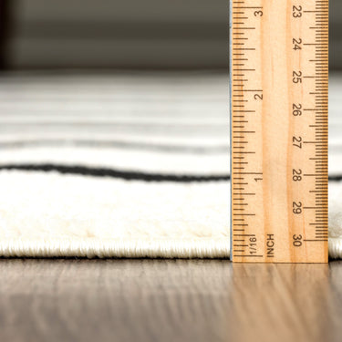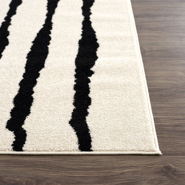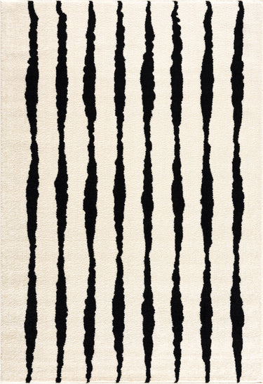 The Nordic collection is inspired by Scandinavian decor to bring together neutral black and white tones into a decor space. This rug design has an Ivory background with black striped lined running vertically throughout the rug. A twist on your simple striped rug, a design with its own personality.