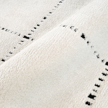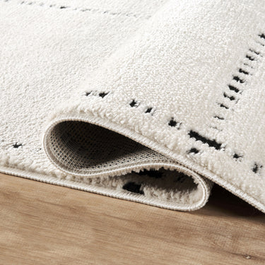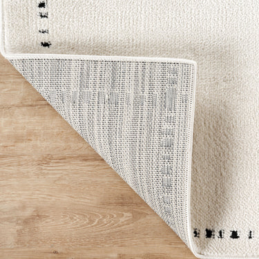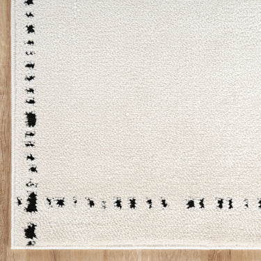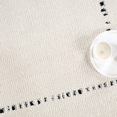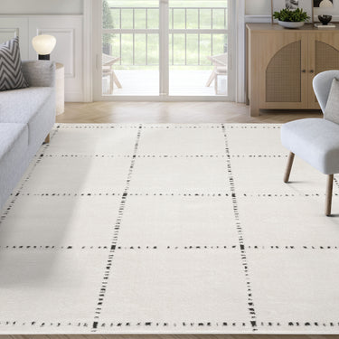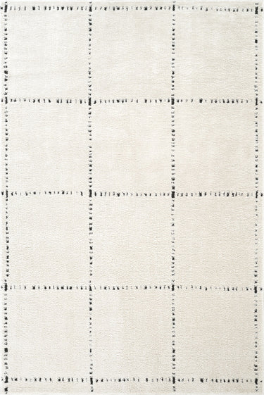 Clean lines and soft texture come together in this minimalist ivory area rug, featuring a simple grid pattern accented by black stitched-like detailing. The modern yet cozy design creates a balanced, structured feel—ideal for contemporary, Scandinavian, or neutral-toned spaces. A perfect foundation for living rooms, bedrooms, or casual interiors with a refined, understated look.