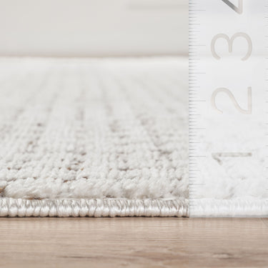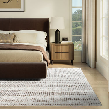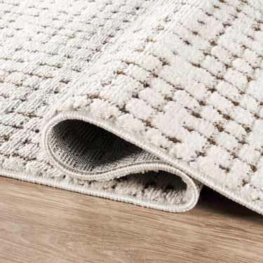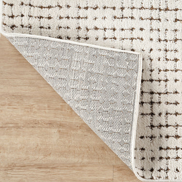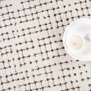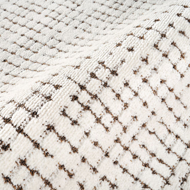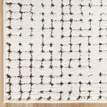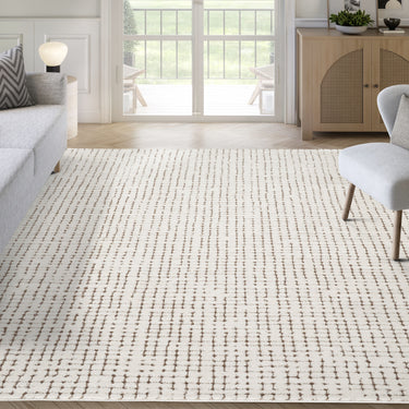 This modern area rug features a soft cream base with a subtle crosshatch pattern in warm brown, creating a textural, woven effect. The minimalist design adds visual interest without overpowering the space, making it perfect for neutral interiors, Scandinavian styles, or contemporary living. Ideal for grounding bedrooms, living rooms, or cozy reading nooks with a touch of quiet sophistication.