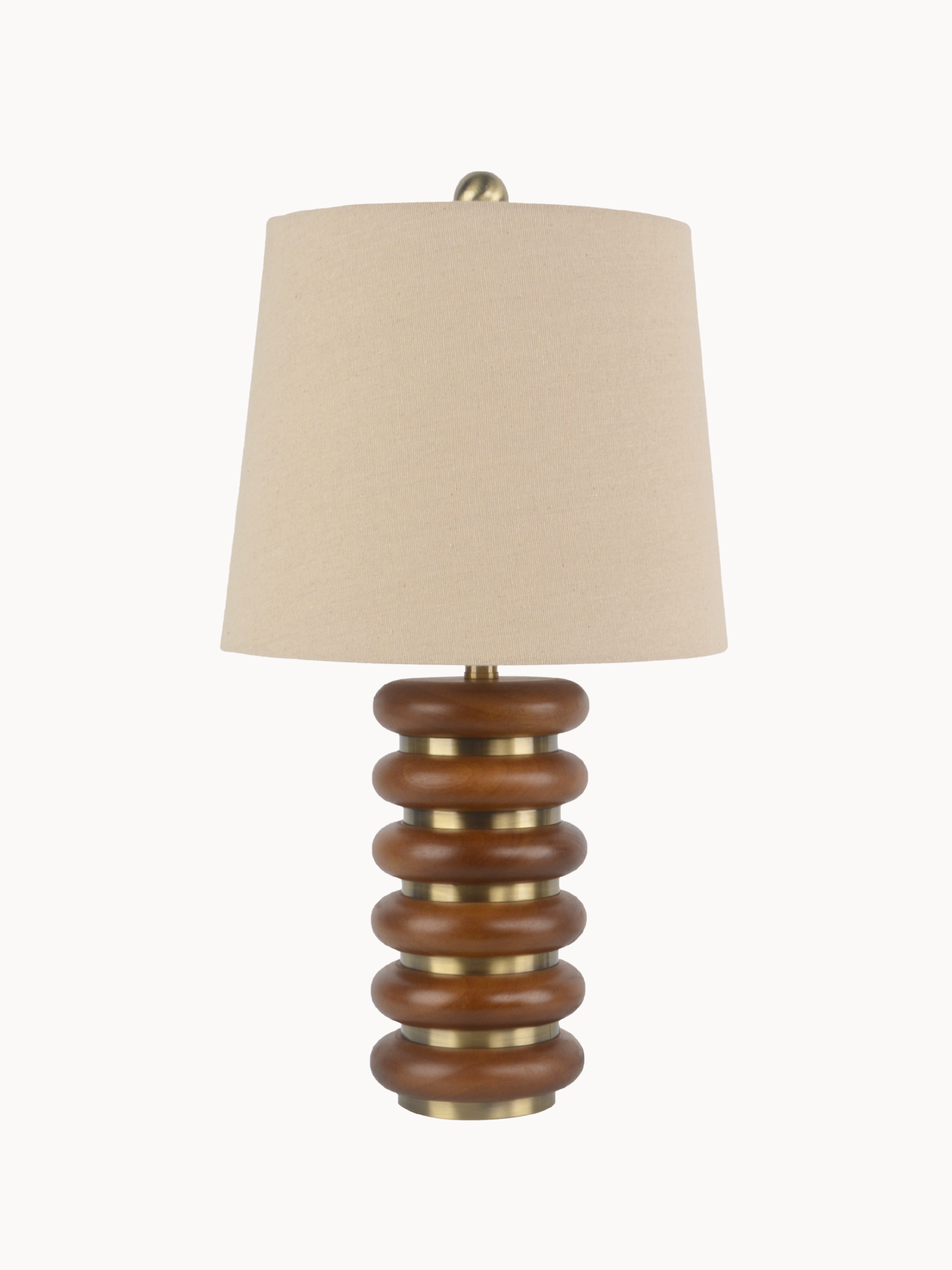 Warm wood tones, brushed gold accents, and stacked ring detailing combine to create a modern yet inviting presence. Topped with a soft beige shade, it offers gentle, ambient lighting that adds character and warmth to living rooms, bedrooms, or study areas.